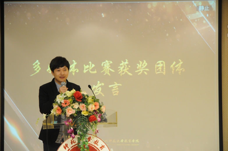教育技能奖一等奖获得者代表肖士彧(教育技术学专业13级)交流参加省多媒体作品设计竞赛获奖的感受