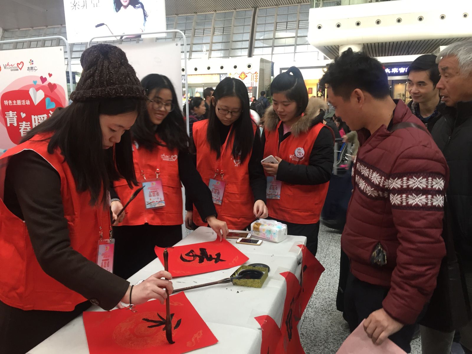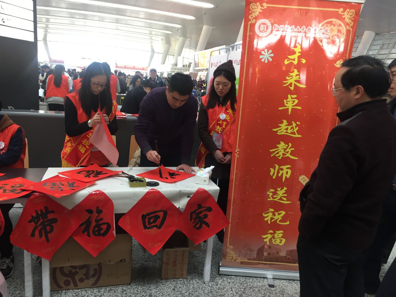 一张张带着墨香的福字增添了杭州东站的年味,拿着一个个充满深情祝福的“福”字,大家脸上洋溢着幸福快乐的笑容。车站熙攘,用温情的文字卸下归家的疲惫,归途漫漫,来自教育学院的祝福将与你们一路前行。