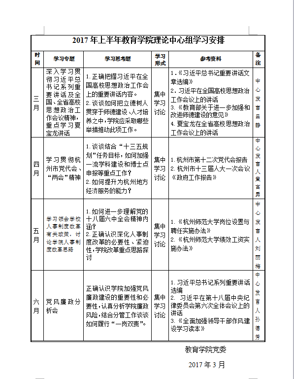 2017年上半年教育学院理论中心组学习安排