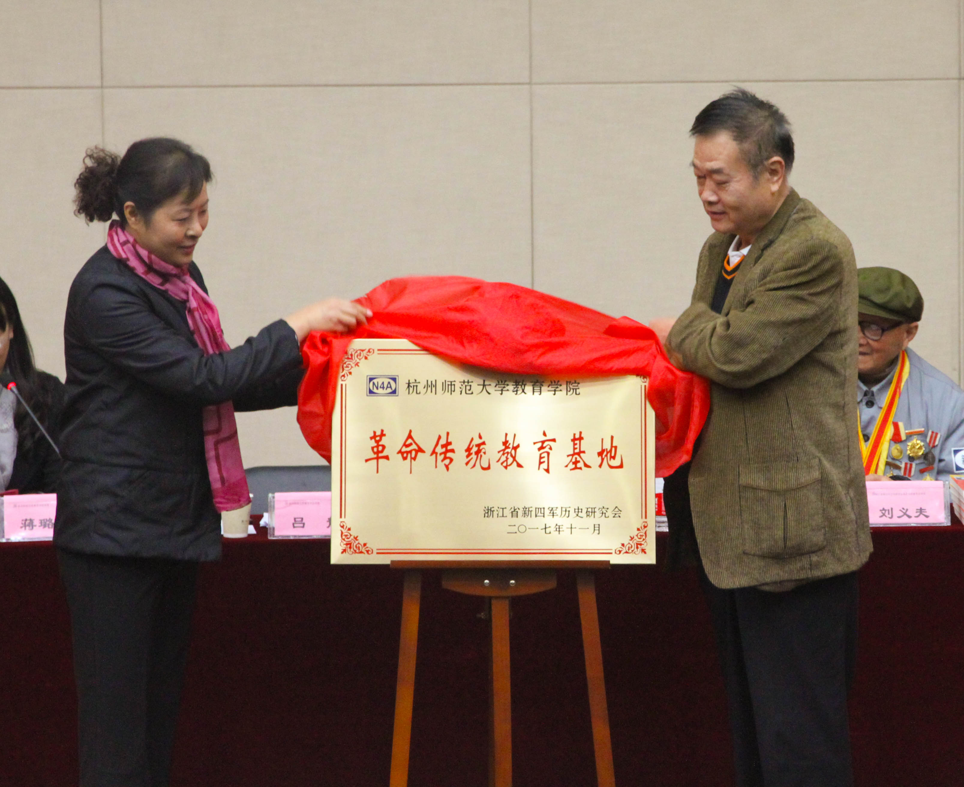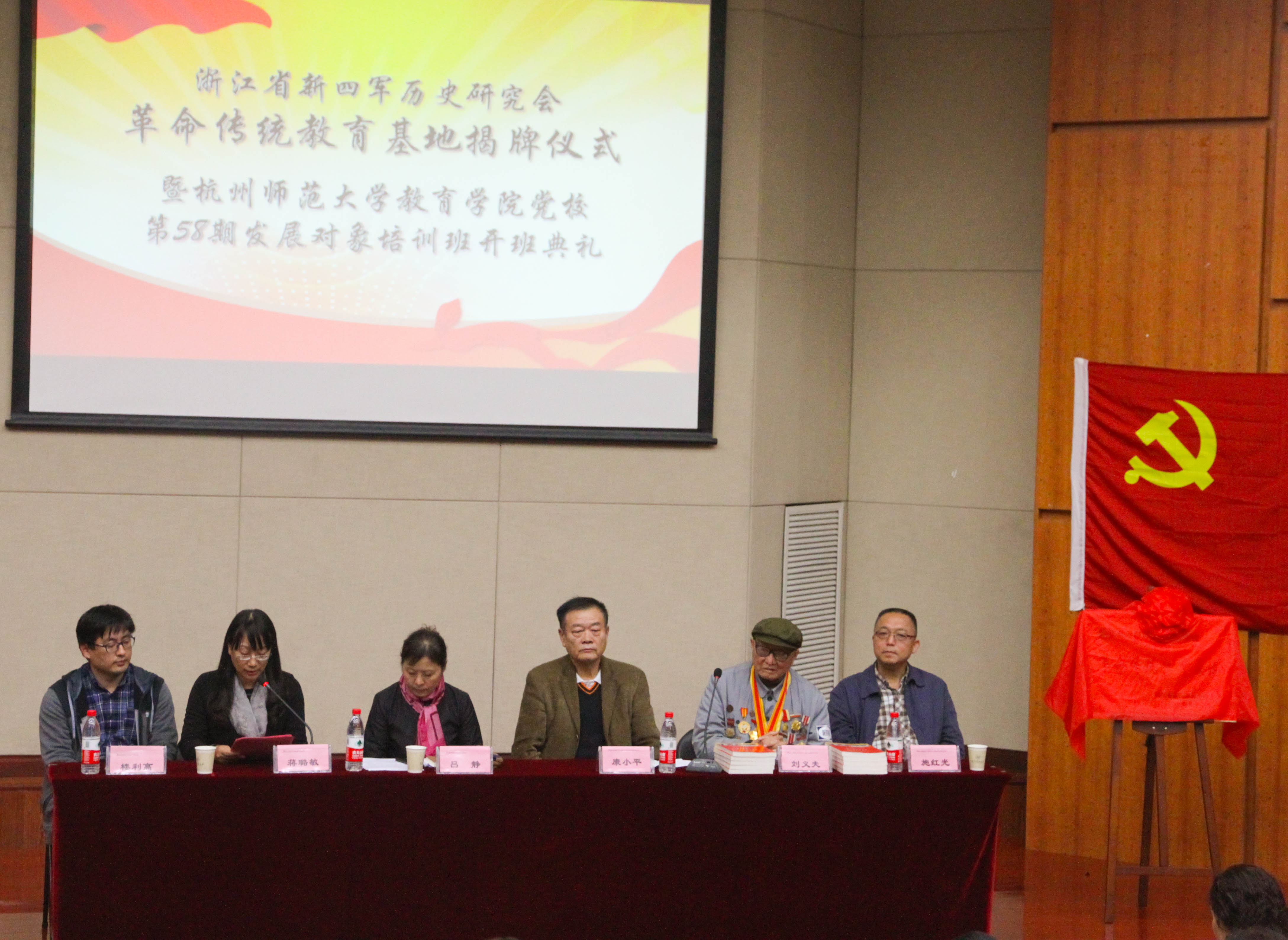 11月15日下午3:00,我院党校第58期发展对象培训班开班典礼暨浙江省新四军历史研究会革命传统教育基地授牌仪式在我校恕园200座成功举行。莅临本次活动的领导有宣讲团团长康小平同志、抗战老兵刘义夫同志、副团长施红光教授、副团长兼秘书长沈如如同志、任丽霞同志。学院党委书记吕静老师、副书记蒋璐敏、党委委员楼利高老师、党委组织员王鑫老师出席本次活动。