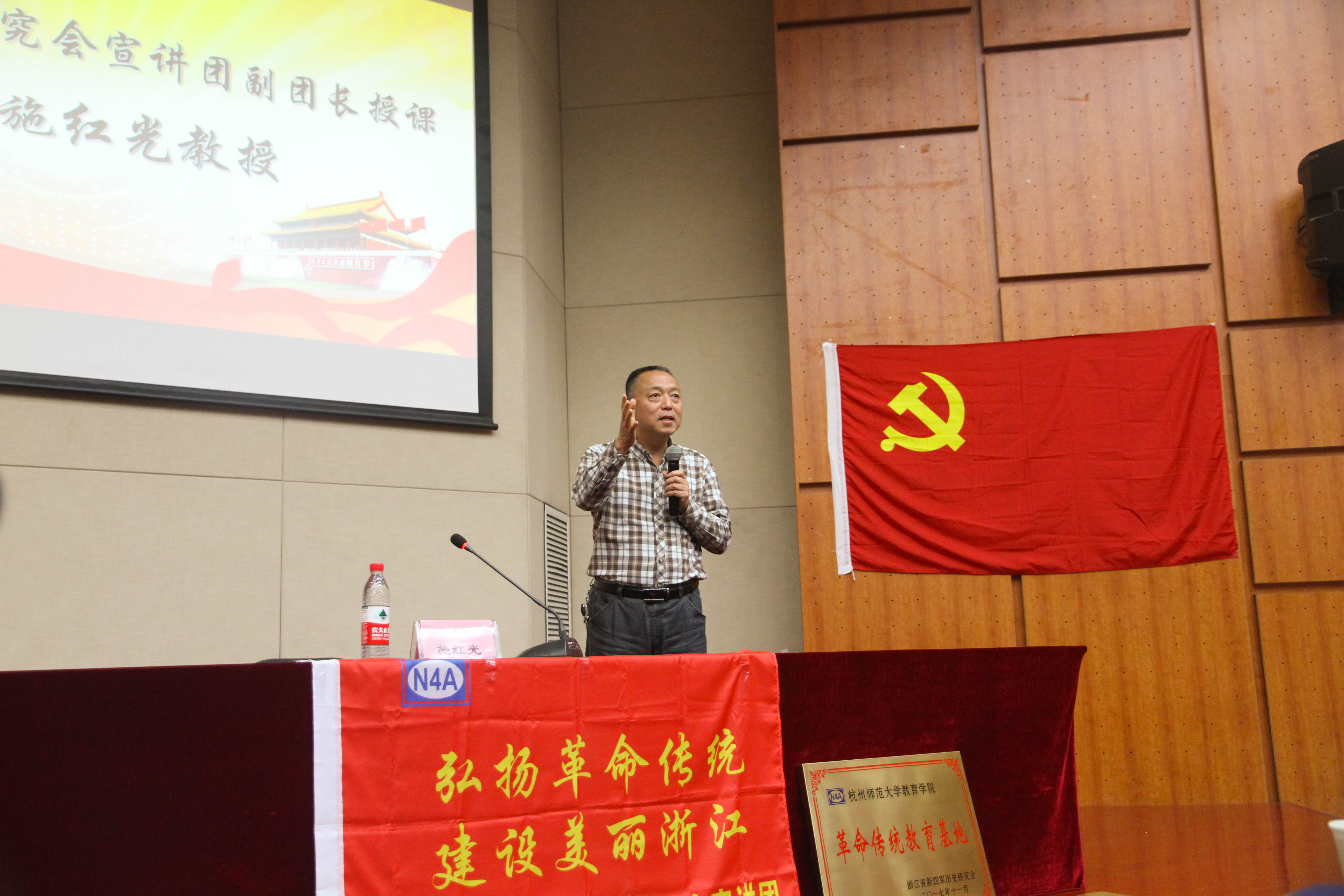 在下半场的党课教授活动中,新四军研究会宣讲团副团长施红光教授开场先抛出两个关于十九大的问题,循循善诱,从共产党组织的优越性讲到共产主义的高尚性,指出共产党是一个代表人民利益,甘愿牺牲,不求回报的团体,这种思想境界高于其他一切宗教组织,也正是这一点代表了它的优越性,使它成为最终带领中国走向稳定并且繁荣与富强的执政党。施教授指出中国共产党之所以会赢,是在于它有马克思主义的科学思想指导,有自我完善、自我净化、自我革新的理念,还有一支支人民军队,它始终代表着人民的根本利益,是“伟大、光明、 正义的”。与此同时,施教授提醒同学们学习党章,改变只为个人利益的入党动机。施教授分析了进入中国特色社会主义新时代的原因,并对我们党的行动指南和行动纲领分别作了阐述。