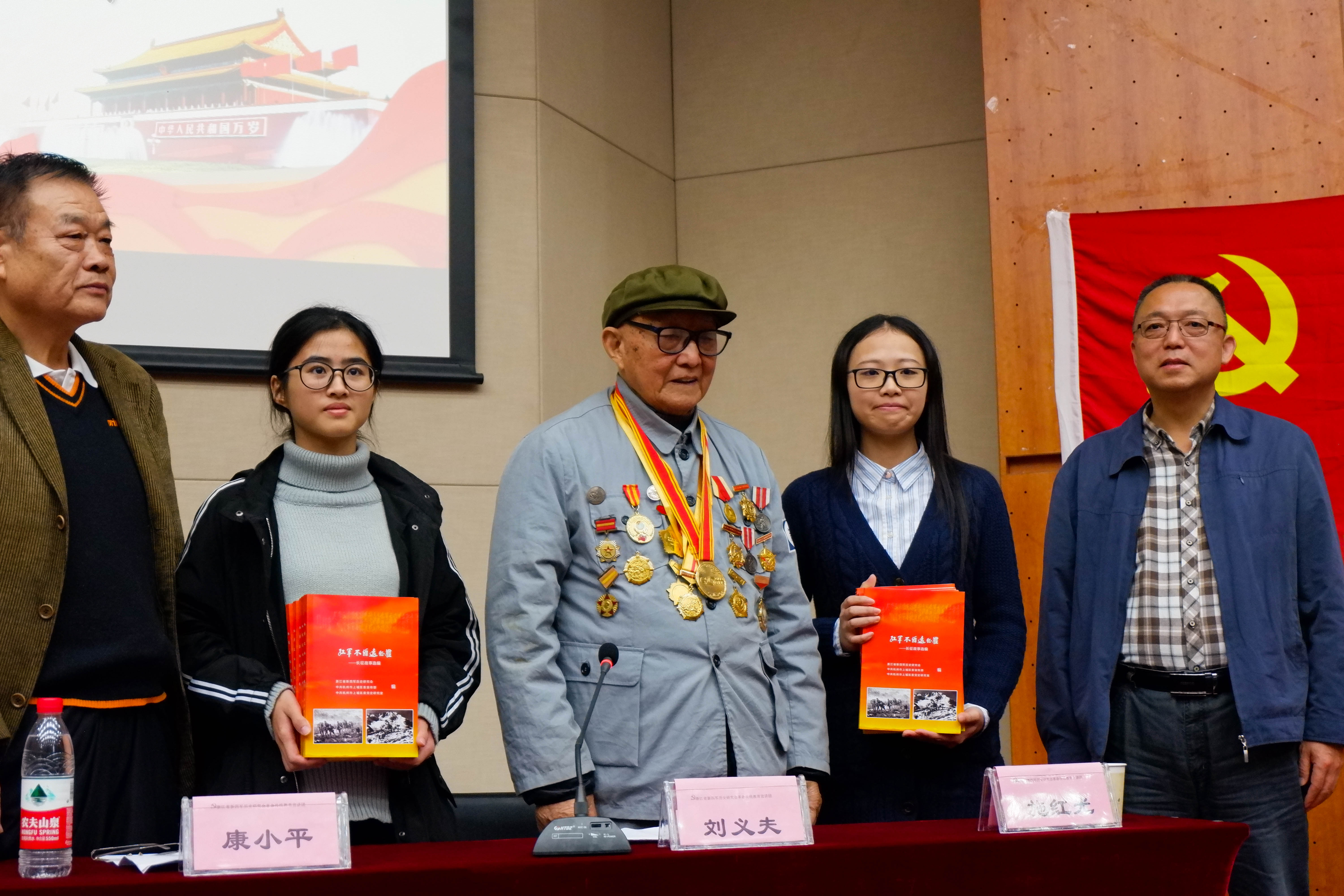 国歌奏唱拉开了活动序幕,宣讲团团长康小平和我院吕静书记上台为本次仪式揭牌并合影留念。抗战老兵、新四军老战士刘义庆同志应邀为在场的党校发展对象们寄语。刘义庆同志参加过抗日战争、解放战争、抗美援朝战争等,二次负伤,多次立功授奖,现已90高龄,仍关心青年大学生的成长成才。他以《寄希望于党的新生力量和后备军》为题,指出党的十九大的伟大历史意义,鼓励同学们关注党的十九大精神,用积极的行动去书写中国共产党历史以及共和国历史更壮丽更光辉的篇章,并提出“生命不息、奋斗不止”、“终生学习,履行好共产党员的使命”等六点建议。同时,新四军宣讲团还准备了《红军长征故事》一书,并现场赠与我院学生。