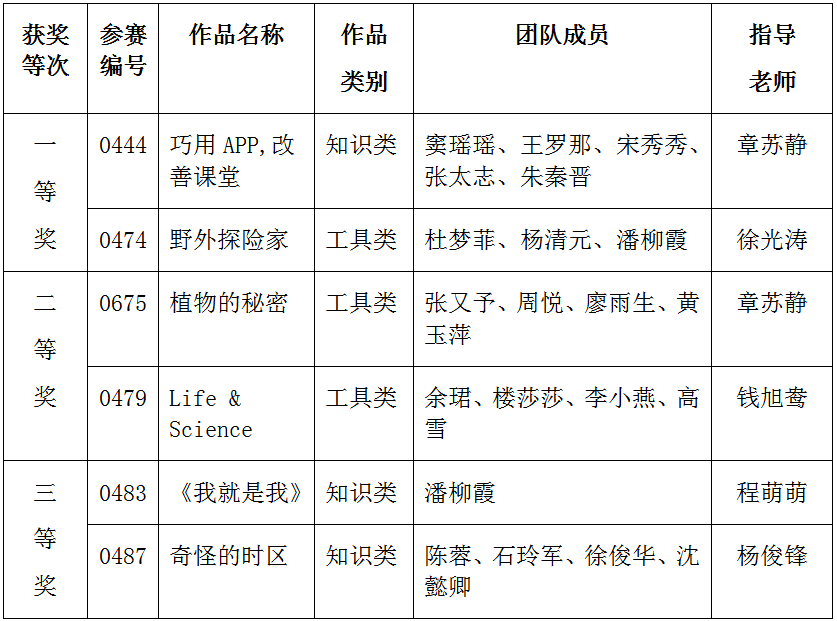 “‘iTeach’全国大学生数字化教育应用创新大赛”由教育部高等学校教育技术专业教学指导委员会主办,旨在引领高校大学生在理解教育需求的基础上,面向真实的教育问题设计作品,并通过学以致用的实践培养创新能力和合作意识。本次大赛共提交作品1076件,只有前25%-35%的作品进入一二三等奖的角逐。评选结果显示只有前8%的作品获得一等奖,前16%的作品获得二等奖。我院6支参赛队伍,获奖名单如下:
