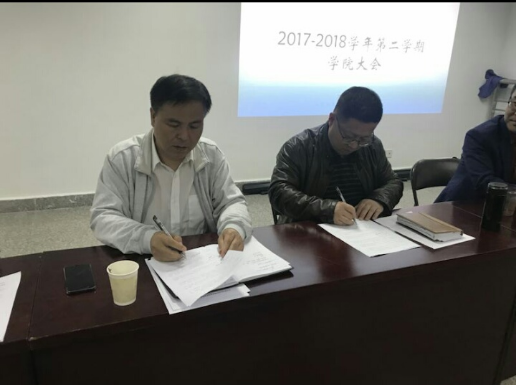 会上,学院院长、党总支书记郑生勇向与会人员明确了责任范围,从政治建设、纪律建设、夯实基层党组织建设、意识形态工作、安全稳定工作等方面强调了责任内容。随后,院领导与分管科室负责人、党支部书记签订了2018年党风廉政建设责任书、意识形态工作责任书、安全稳定责任书等,全院教师签订了意识形态和廉政工作承诺书。