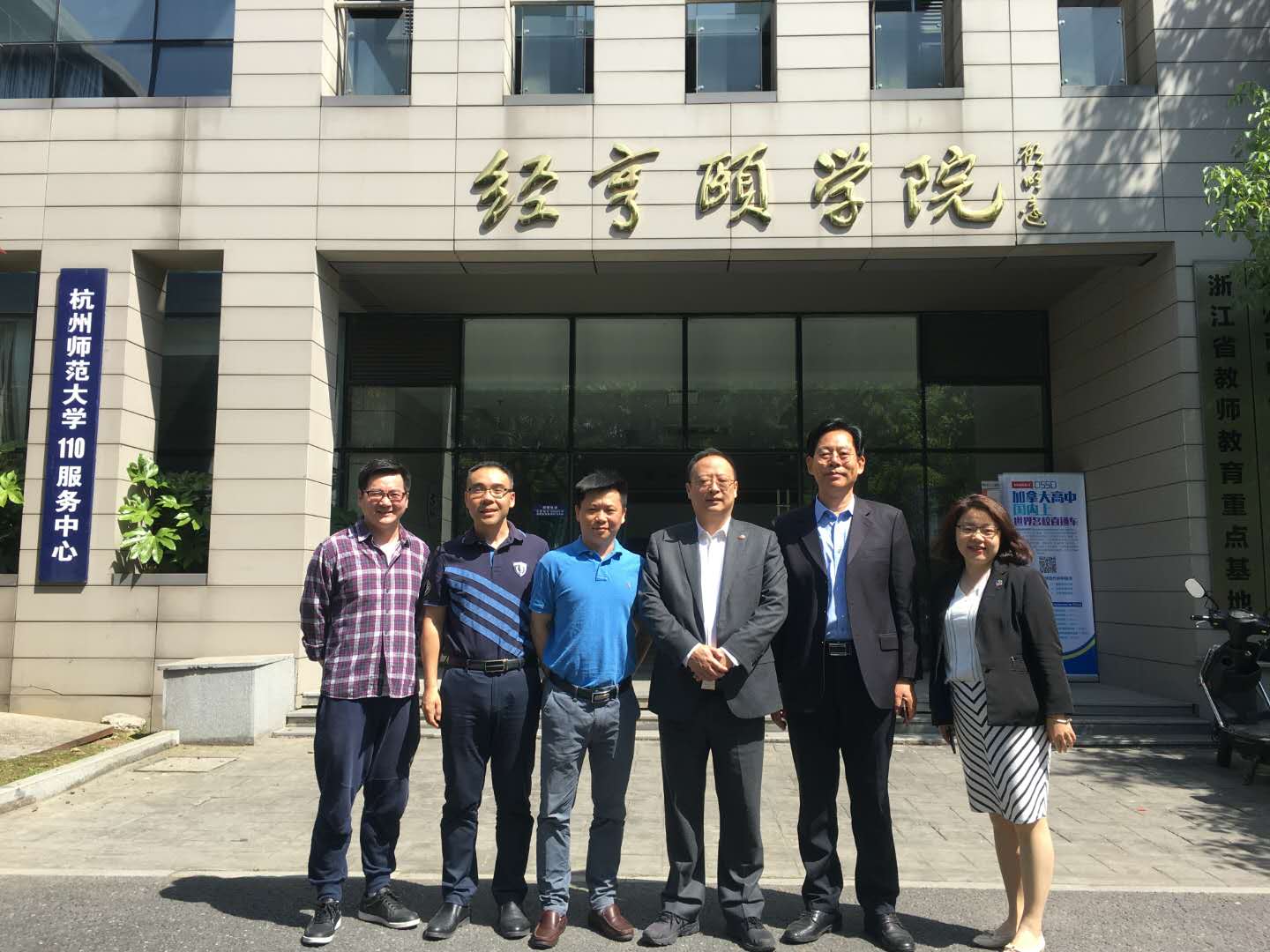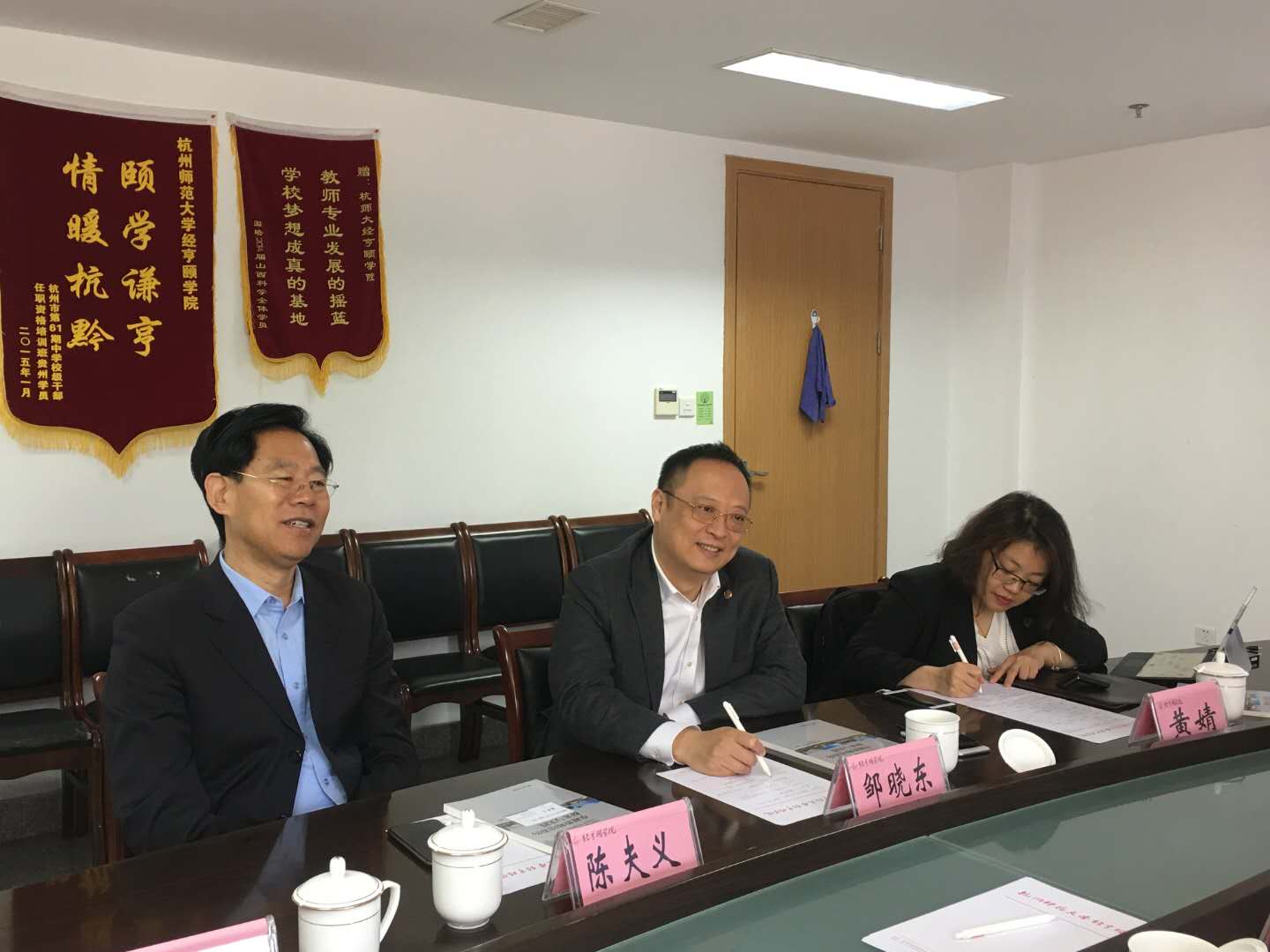 5月4日上午,中旭天下教育集团总裁邹晓东、专家委员会主任陈夫义一行应邀赴我院考察合作办学事宜,杭师大校友总会秘书处处长蔡云飞、学院副院长蒋永贵、副书记沈嫣接待并洽谈。