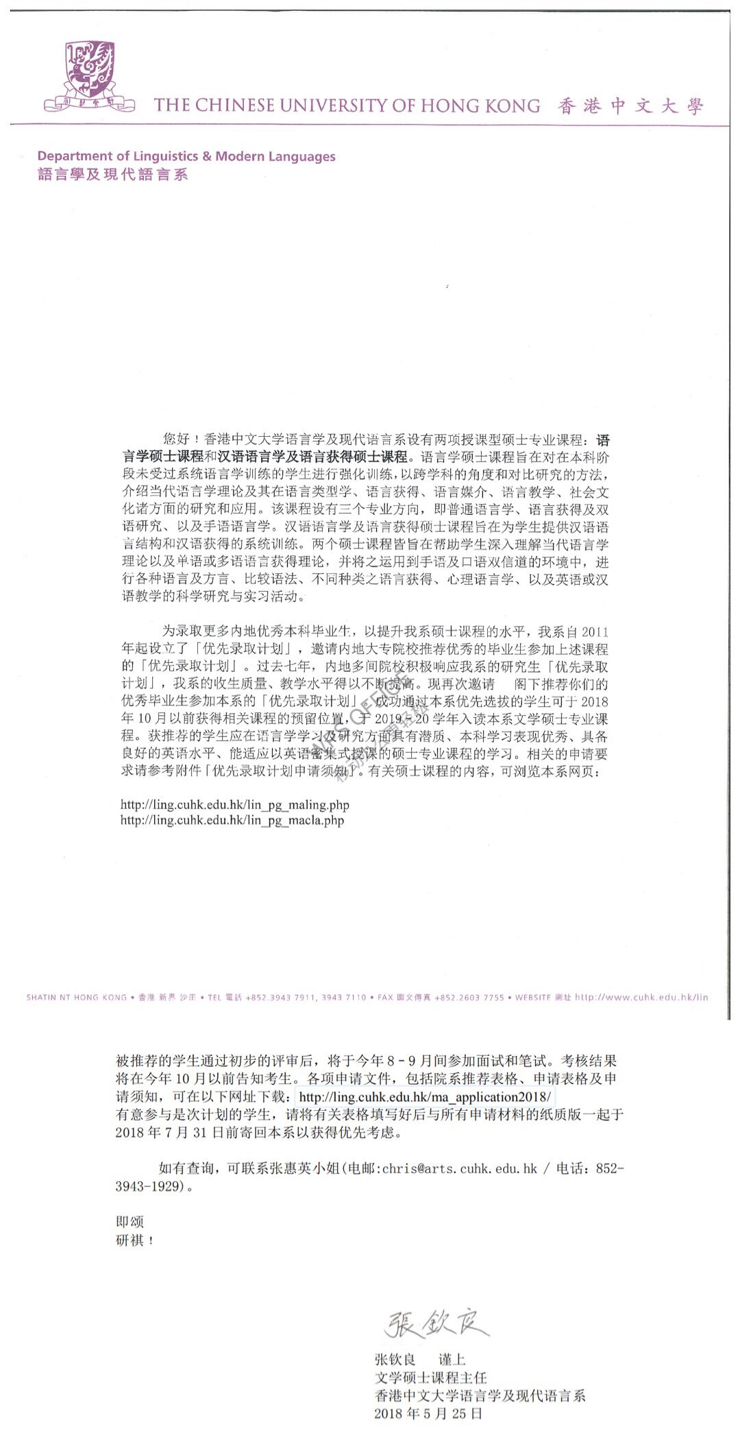 香港中文大学语言学及现代语言系自2011年起设立两项授课型硕士专业课程的“优先录取计划”,邀请内地大专院校推荐优秀本科生参加。两项课程为语言学硕士课程和汉语语言学及语言获得硕士课程,成功通过选拔的学生可于2018年10月以前获得相关课程的预留位置,并于2019-2020学年入读相关院系文学硕士课程。