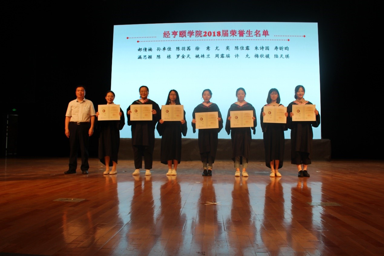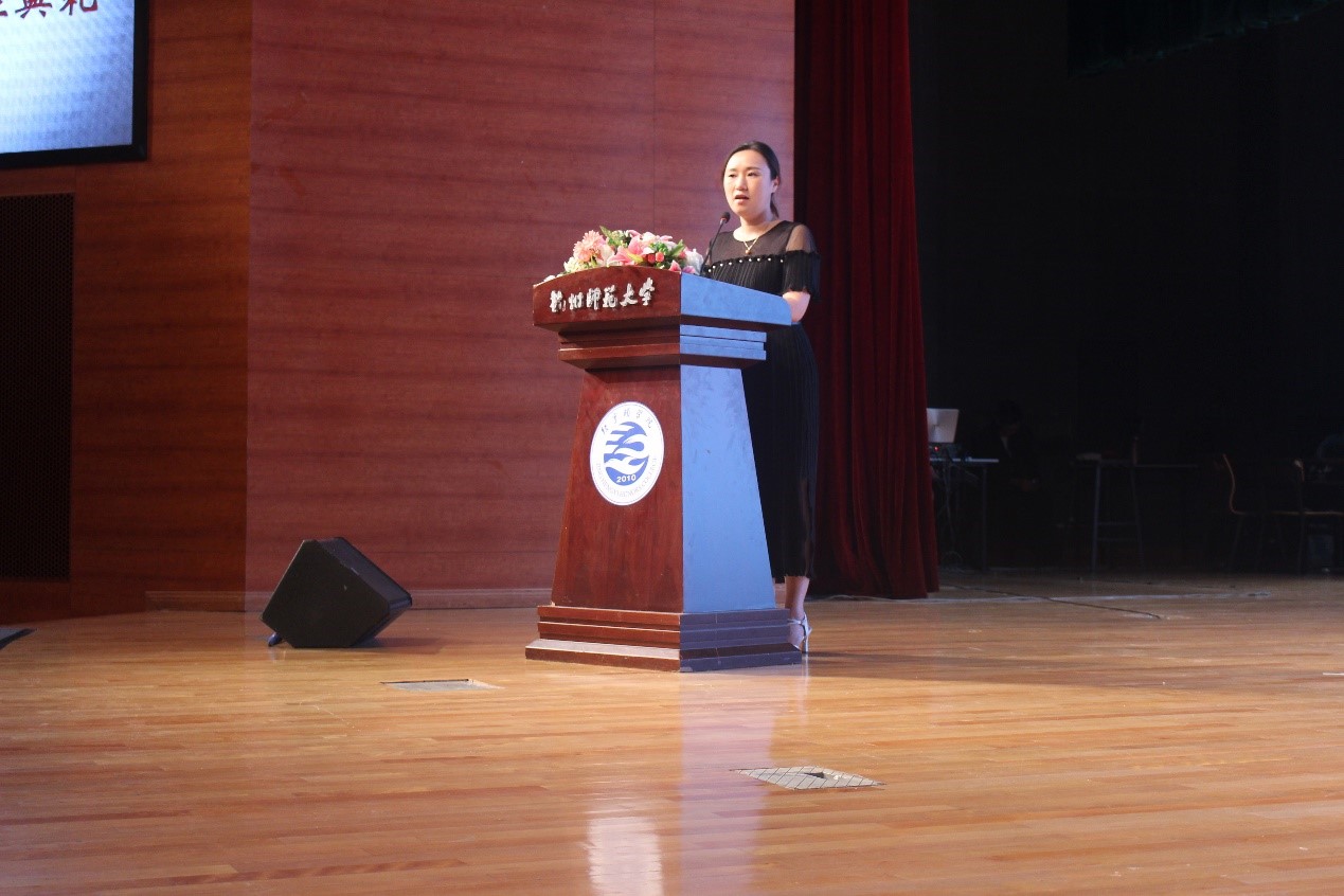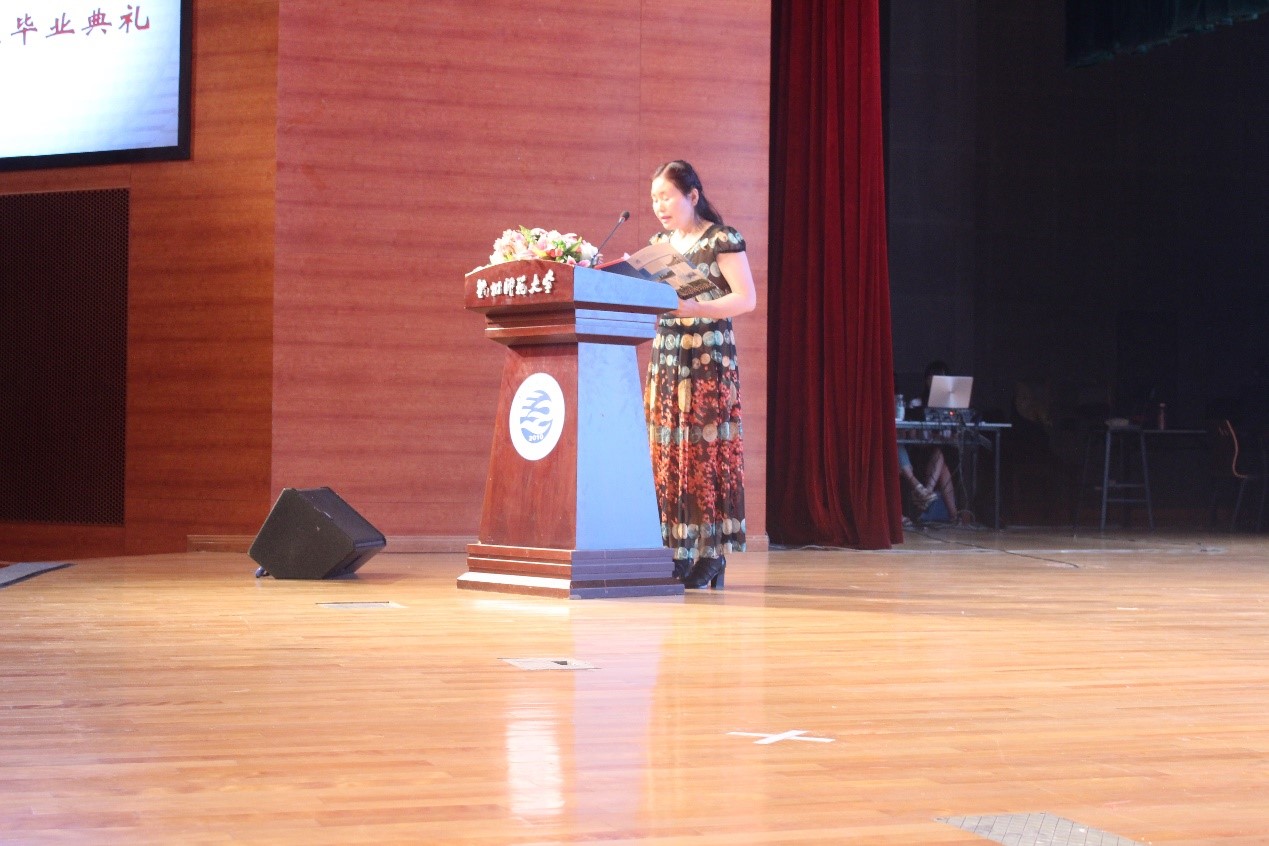 典礼第三项是蒋永贵副院长宣读2018届荣誉生名单,并由经亨颐学院院长郑生勇和颁发荣誉证书。叶哲铭副院长宣读经院荣光特别奖表彰文件表彰考取研究生的2018届毕业生,张树国教授等老师代表为学生颁奖。表彰结束后,教师代表黄芳发言。黄老师强调了保持一颗“热心”的重要性,要在逆境中奋斗出精彩人生的增量,给大家以鼓励和振奋。