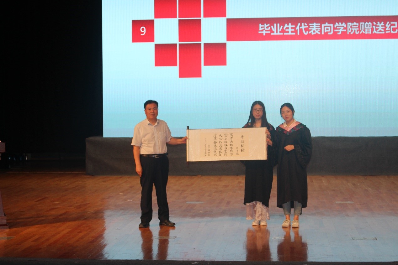 郑生勇院长为2018届文理科班长罗雁云、徐意赠送笔筒。笔筒的设计者张伟闯老师解释了它的寓意,上面镌刻了经亨颐学院的院训院规,意在提醒毕业生们今后不忘自己是经院学子,时时勉励。毕业生们送给学院一幅书法作品,拳拳感恩之心溢于言表。郑生勇院长在致辞中再次表达了对学生们美好的祝福,要追求卓越,勇于承担、保持对国家发展的热情,与优秀为伴。