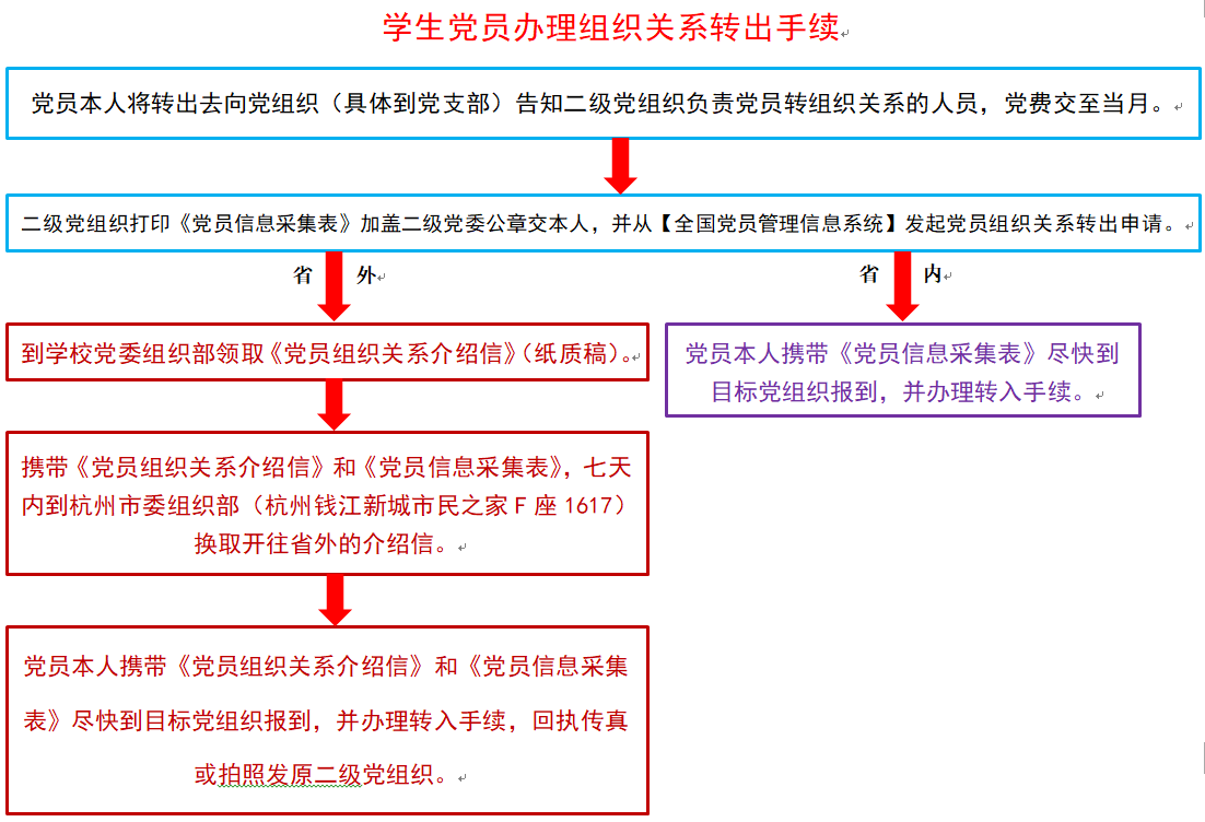 (5)党员本人尽早凭《党员信息采集表》《党员组织关系介绍信》(仅省外需要)在有效期内及时到接收单位(介绍信抬头党组织)办理党员组织关系转入手续,转出到省外的党员请将组织关系介绍信的第三联回执用传真、快递或电子信息等形式反馈至原所在二级党委、党总支。