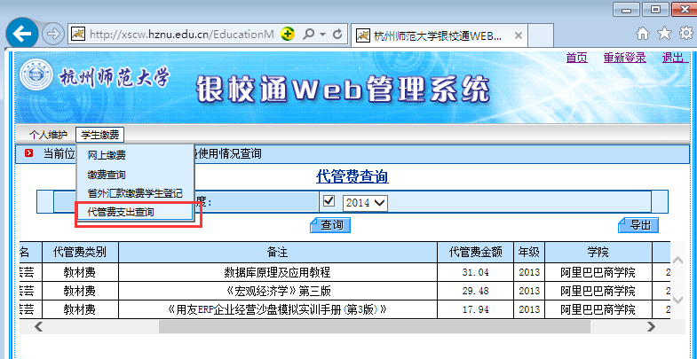 教材领用明细查询:点击菜单栏中“学生缴费”—“代管费支出查询”,选择查询学年可以查询每年的教材费使用明细。