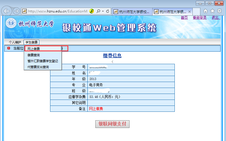 登录系统后,点击“学生缴费”—“网上缴费”—“银联网银支付”