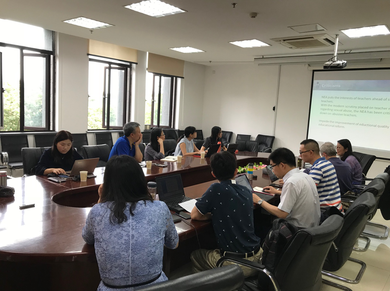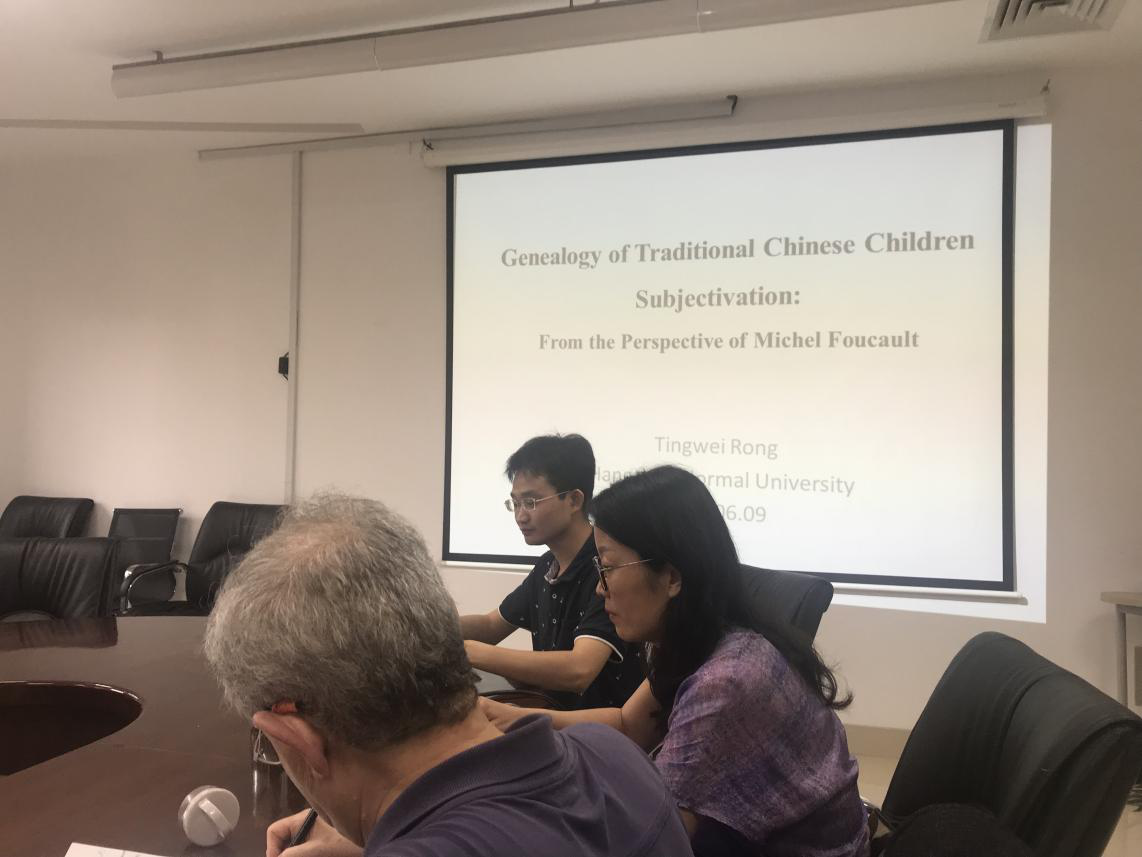 许建美副教授就教师的新工会取向与在座师生展开了讨论,她对NEA(National Education Association)的历史作了简单的介绍,探讨了新教师工会主义的兴起以及其兴起的原因、愿景、新的措施和面对的挑战。戎庭伟博士基于米歇尔·福柯视角采用谱系学分析方式对传统中国儿童主体性进行了分析,分析探讨了中国传统的家庭伦理道德以及从历史角度看待中国儿童主体、儿童主体的新的可能性这些问题。屠莉娅副教授基于政策文本计算对民国以来基础教育课程政策话语变迁进行了研究,就研究目的与背景研究内容与框架、研究方法与思路、问题和难点分享了她的研究。刘徽副教授基于慕课数据分析探讨了学习时间的长度与信息呈现的模式是否相关性的问题。冯加渔博士则对一个世纪以来约翰·杜威的《民主主义与教育》的中文翻译进行了回顾和讨论,指出了不同译者在翻译这本书的同时也传达出自己对杜威实用主义教育思想的独特理解。沙龙最后,Leonard J. Waks教授和张华教授对五位老师的汇报进行了精彩点评,并与在场师生进行了热烈讨论。