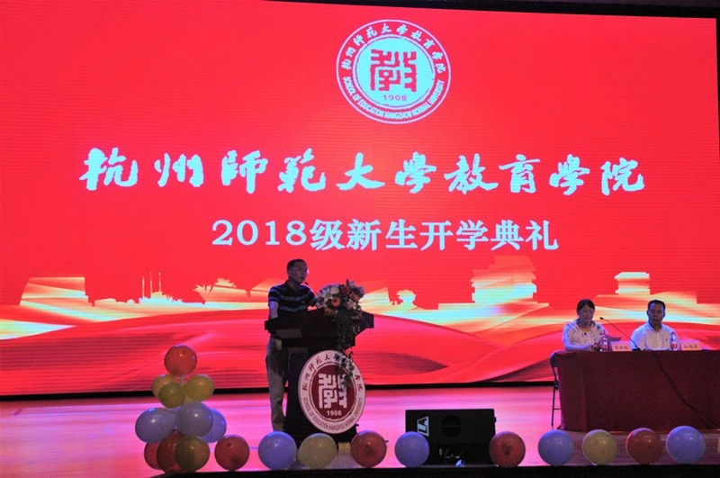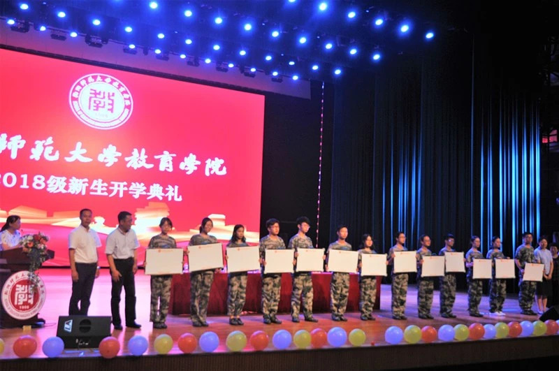 9月3日,我院2018级新生开学典礼在1500座顺利举办,510名本科生、102名研究生参加典礼。莅临本次典礼的嘉宾有:教育部教育学院名誉院长张斌贤教授,学院党委书记吕静老师,副院长刘丽梅老师、孙德芳老师、严从根老师,我院1987届优秀校友、特级教师章献明老师,校高端人才臧玉峰老师,校卓越特聘人才俊才刘志方老师,学院各系负责人,2018级全体班主任、研究生导师代表、学院行政教师代表及全体辅导员。本次开学典礼由学院党委副书记蒋璐敏老师主持。