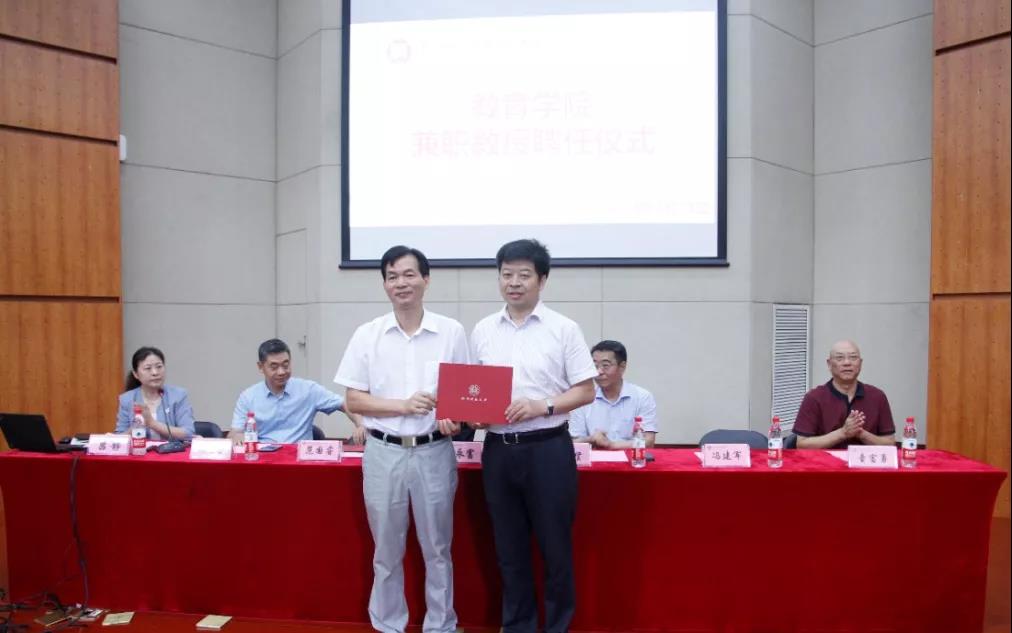 9月18日上午,我院兼职教授聘任仪式在恕园7号楼200座举行。副校长陈永富教授,特聘教授范国睿先生,特聘教授冯建军先生,华东师范大学教授、博士生导师杨九诠先生,教育学院名誉院长张斌贤教授、教育学院学术委员会主任童富勇教授以及我院领导班子成员、师生代表应邀出席本次受聘仪式。我院党委书记吕静老师主持仪式。