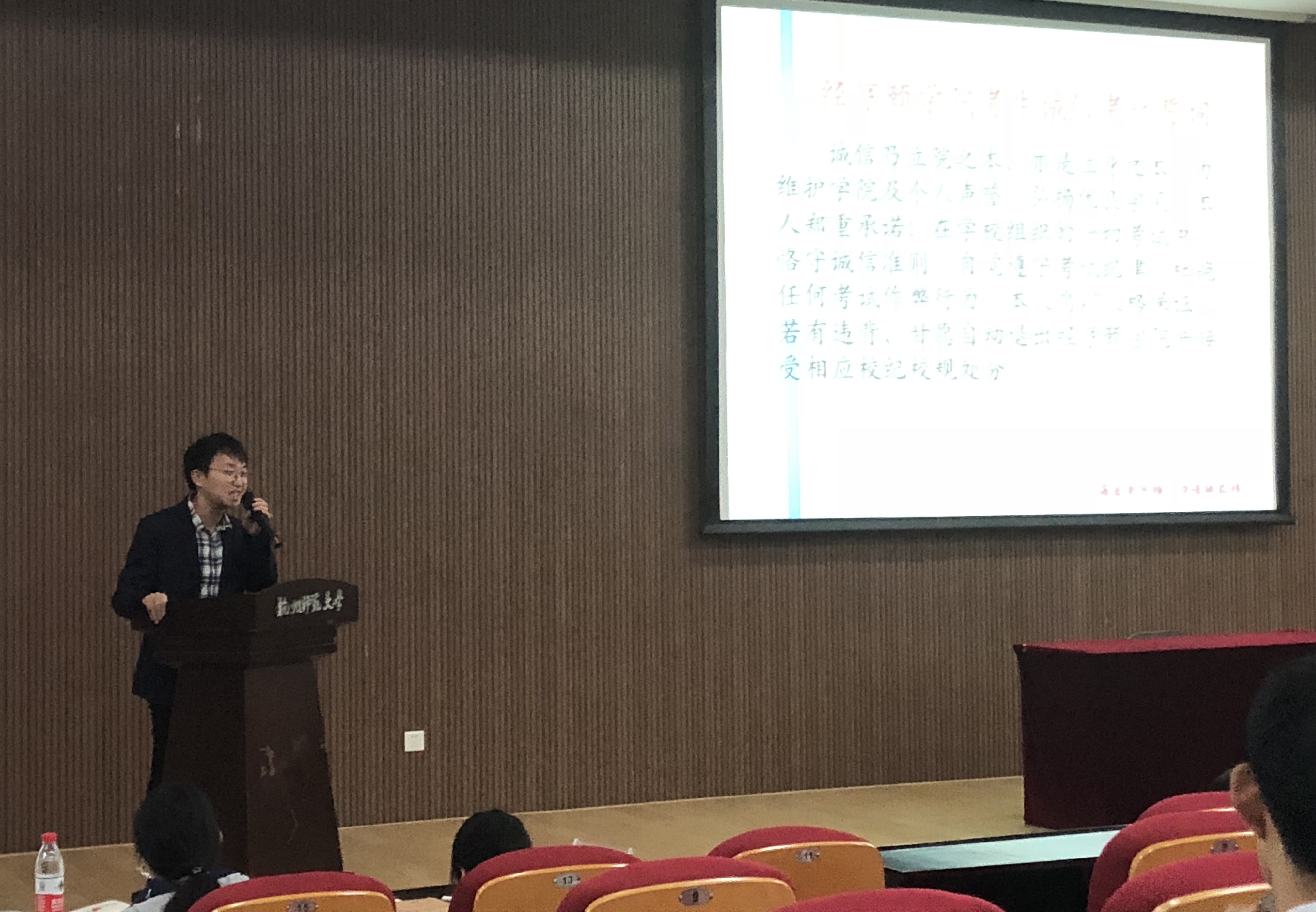 会上,楼诗蝶老师向18级新生介绍了日常考勤规范,并强调诚信考试也极为重要。她希望每一个经院学子都能恪守底线,做诚信之人。接着,来自文科实验181班的学生代表郑卓远同学带领同学宣读了经亨颐学院考生诚信考试誓词。毛少汉老师做了最后的总结发言,他希望各位同学不仅要在考试中要做到诚实守信,而且在为人处世方面也要做到以诚待人。