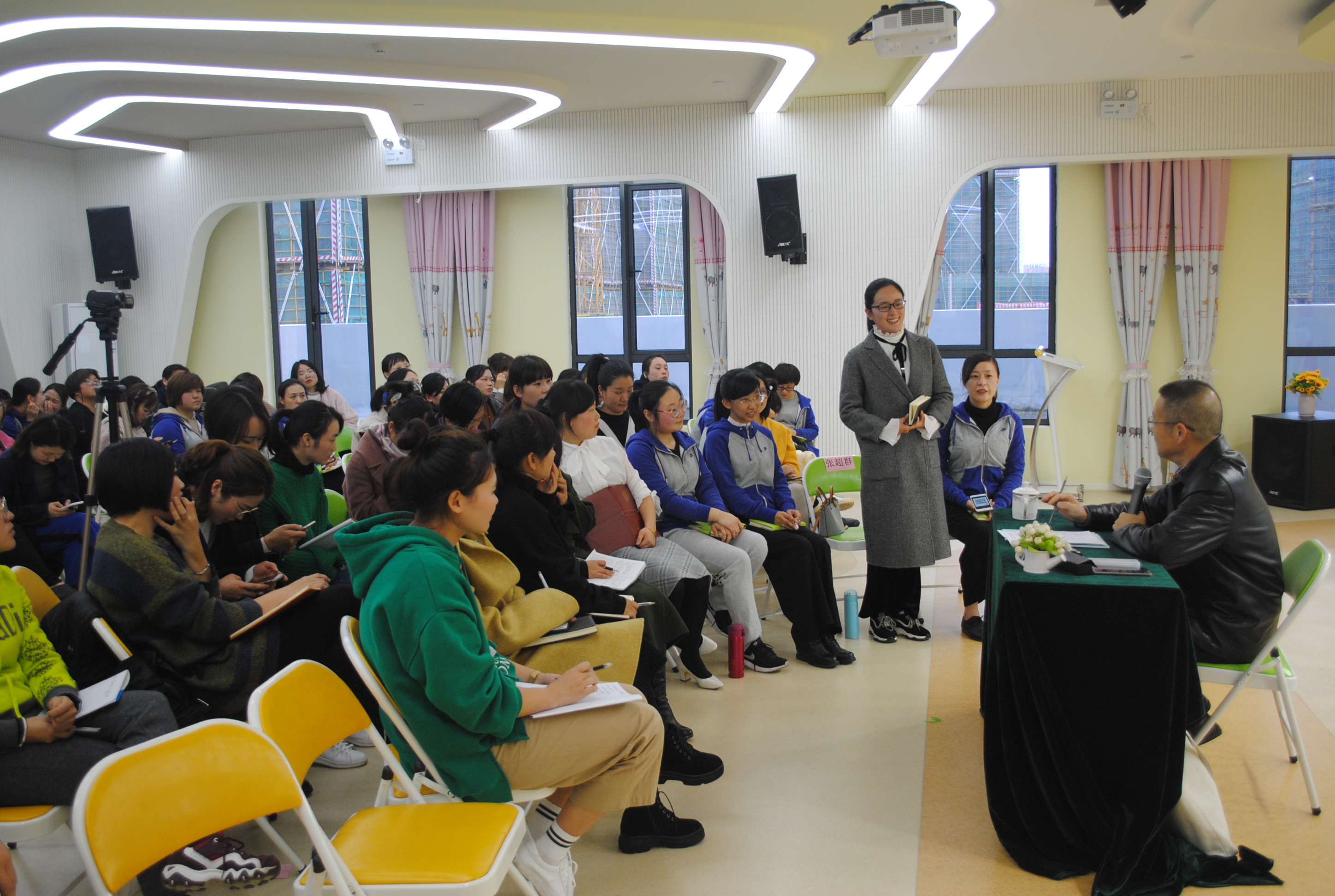 揭牌仪式结束后,朱教授与工作室18名成员及临安区幼儿教师代表座谈。朱教授在交谈中了解了成员的基本信息和现有科研及教学水平,并通过分享自身的科研经验心得,分析了浙江省各级各类课题申报情况,鼓励成员们积极申报课题,希望通过“朱晓斌名师工作室”的学习与交流,综合提升临安区学前教师科研与教学水平。