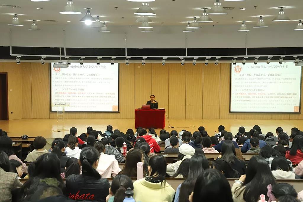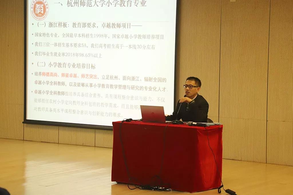 会议中,王强老师以“培养目标-毕业要求”的对应矩阵进一步阐明了一位优秀人民教师需要具备的十大素质,使学生对优秀教师地指标有了更进一步的认识。随后,他详细介绍了学科基础平台课程和专业核心课程及其对应类型,使同学们对所学科目的类别与目标更为明朗。会议期间,王强老师同时向全体学生就小教师范专业认证的理念和指标作了介绍。他指出,本次认证的核心是“一践行三学会”,践行师德及学会教学、学会育人、学会发展。此外,他介绍了我校小教专业的背景与优势,并强调我校小学教育专业培养目标为培养师德高尚、师能卓越、师艺突出,能立足杭州、面向浙江、辐射全国的卓越小学全科教师,以及能够从事小学教育教学管理与研究的专业化人才。