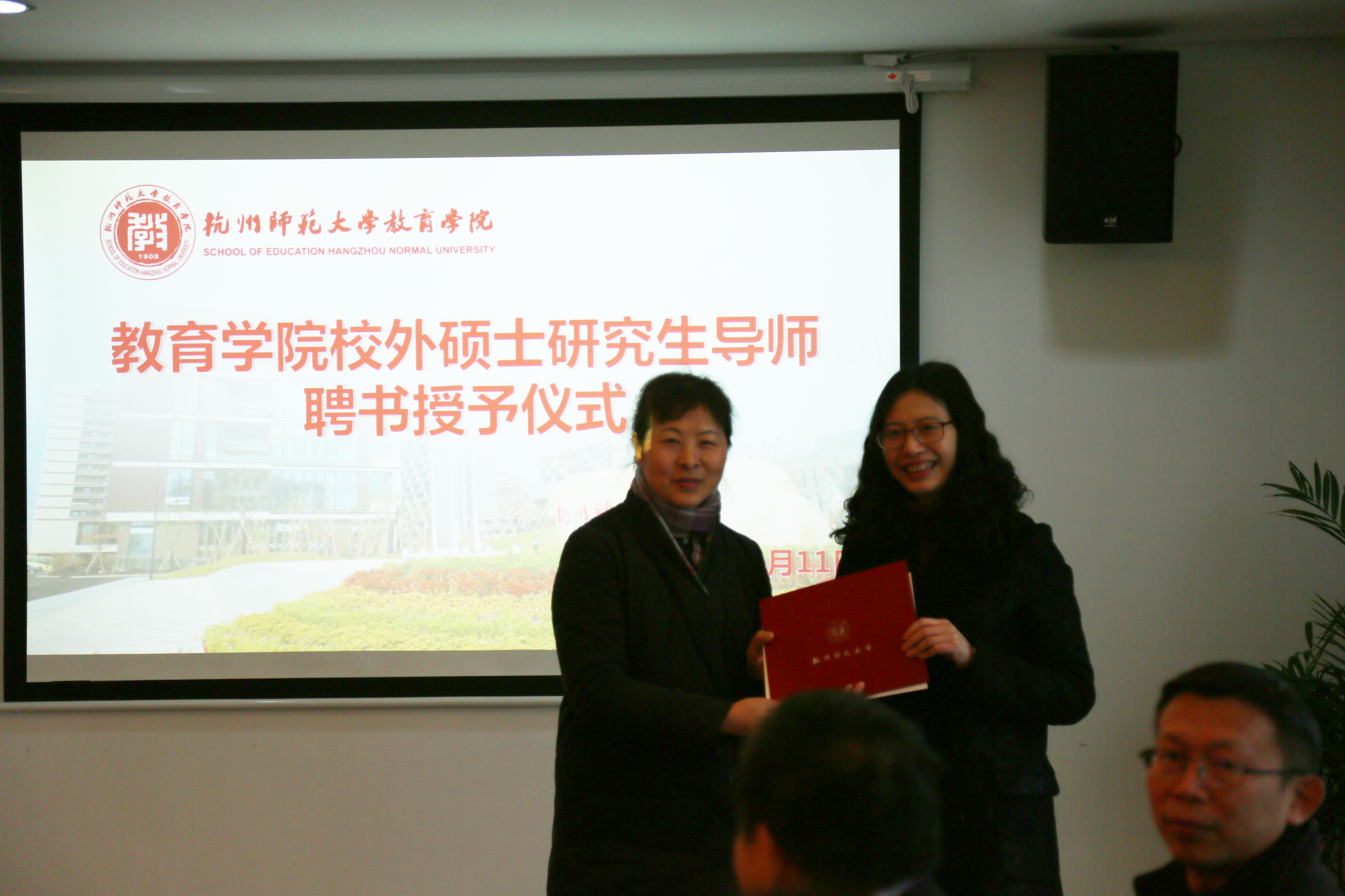 仪式开始,严从根副院长介绍了参会的九名导师。他们分别是色情av影片 附属医院方妍彤老师,杭州市省府路小学关祥荣老师,杭州市求是教育集团江萍老师,浙江省宁波市奉化区实验小学刘善娜老师,色情av影片 东城实验学校张立栋老师,杭州市学军小学张军林老师,杭州市青少年活动中心章献明老师,杭州市第七人民医院谭忠林老师,杭州市育才外国语学校、杭州市公益中学潘志平老师。随后教育学院吕静书记依次为这九名校外硕士研究生导师颁发导师聘书。