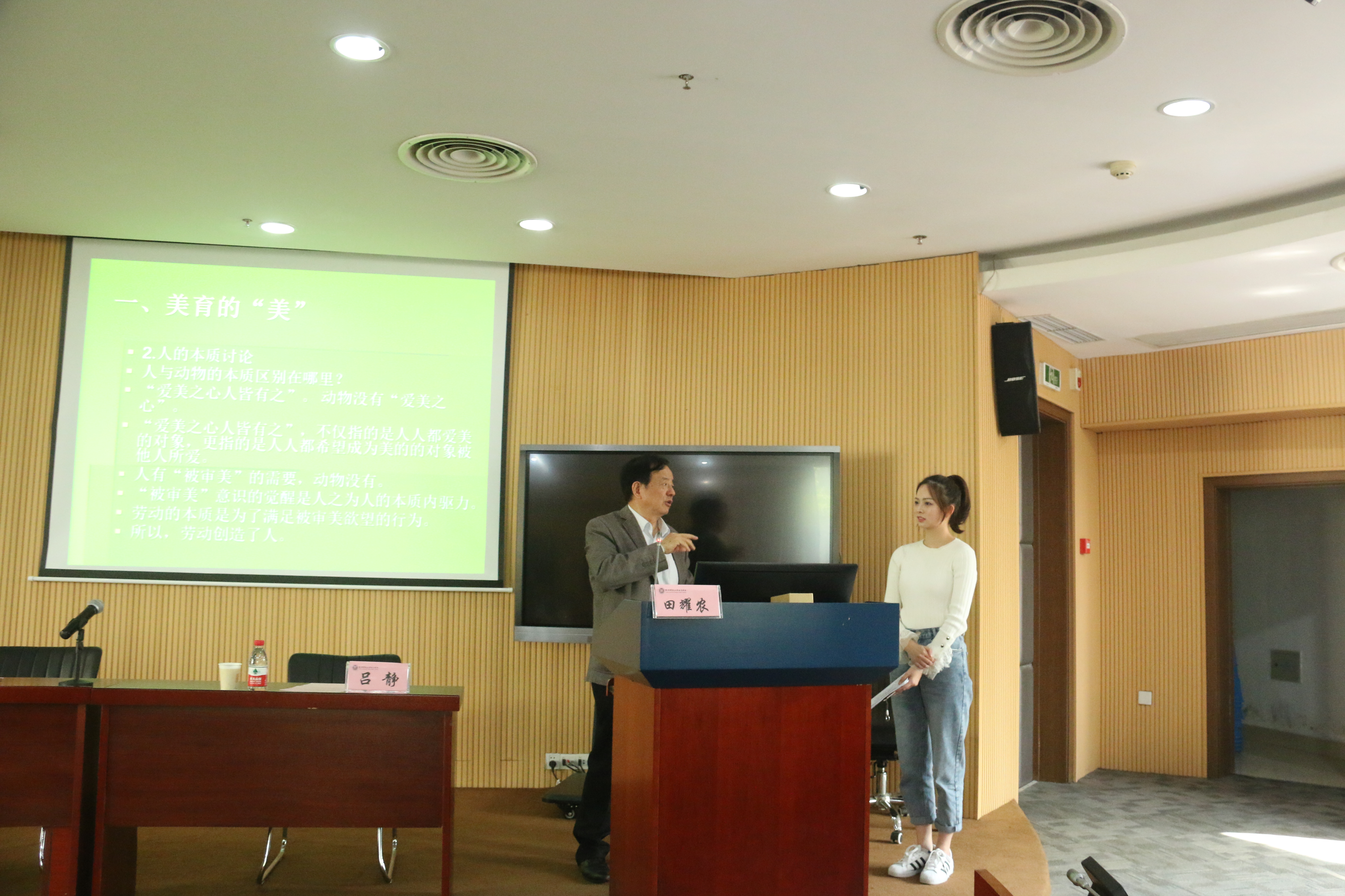 整场讲座,田教授从美的本质讨论、美的八大观点、美丑比较、人的本质讨论等几方面,生动地论述了美育中的“美”的概念,引发了师生们的深度思考和广泛讨论。讲座伊始,首先在阐述“美”的含义中,田教授从历史的角度和贴近生活的教育事例为我们阐述了“美”的本质,其次,田教授将数以百计的美论归纳成八条,使同学们十分清晰地了解了人们对于美的集中观点。接下来,田教授用幽默风趣的语言和事例讲述了他所认为的“美”的观念,田教授认为,“美是人类特有的判断方式,美是判断感性的、经验性对的直观判断”,田教授还特别强调,“美除了贵的品质,还需要真和善的前提,贵是美的充要条件,真和善是美的充分条件,所以说美为贵。”田教授还用《巴黎圣母院》中的几个经典人物,为我们进行了美丑比较,使我们进入美和丑的理性判断,根据美与丑的内容,可以维持初级判断结果,也可以推翻初级判断的结果。接下来,田教授更深层次的对人的本质进行了讨论,并指出“人有爱美之心,不仅指的是人人都爱美的对象,更指的是希望成为美的对象被他人所爱。”而人之与动物的本质区别是人有“被审美的”区别,而动物没有。田教授对“美”的理解富有深度,对美的阐释层层递进,使同学们受益颇深。