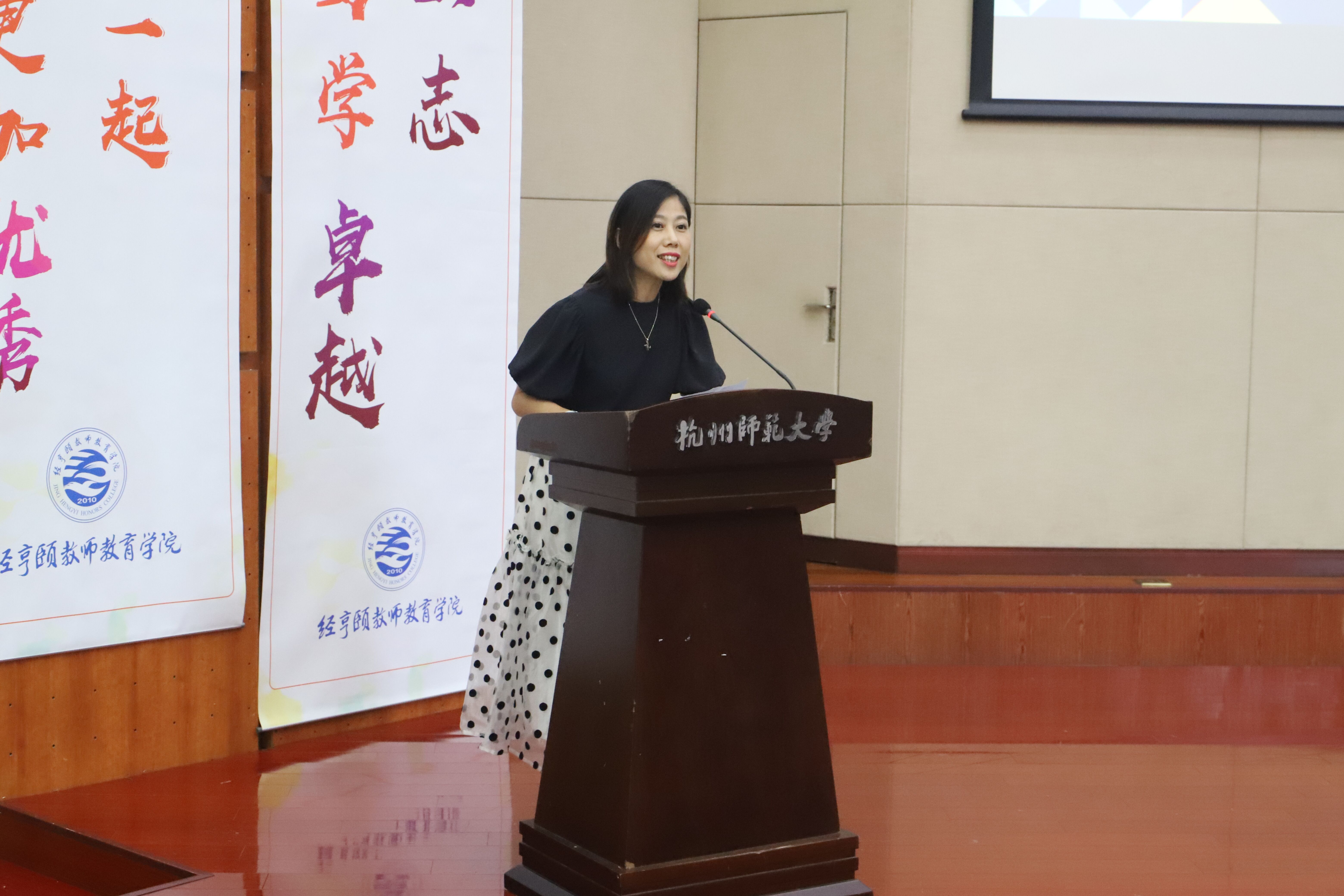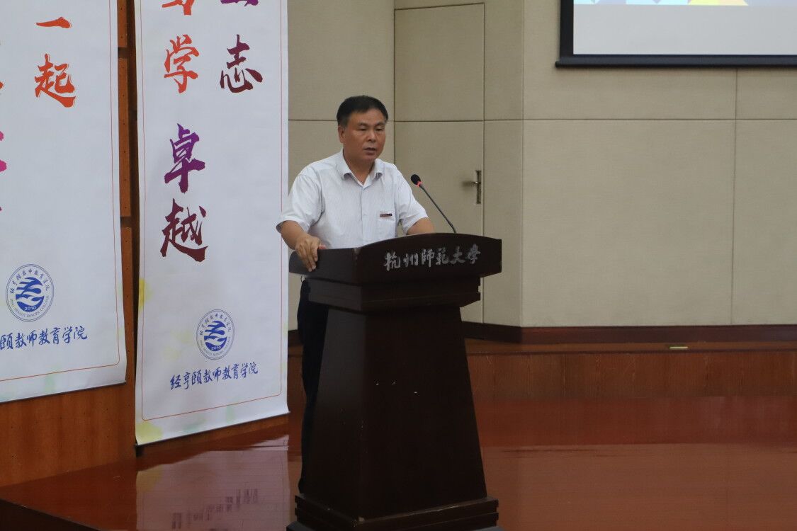 郑生勇致辞,他代表学院向新同学表达热烈的欢迎和美好的祝愿。他强调,身为经亨颐教师教育学院的一员,大家应该做到三个“合一”,即心术合一、学思合一和知行合一,新同学们要学会用创新思维来对待自己的大学生活,更要时刻牢记自己为何而来。他希望,在大学里同学们不仅收获优异的成绩,还能拓宽自己的视野,形成正确的价值观、人生观和世界观。