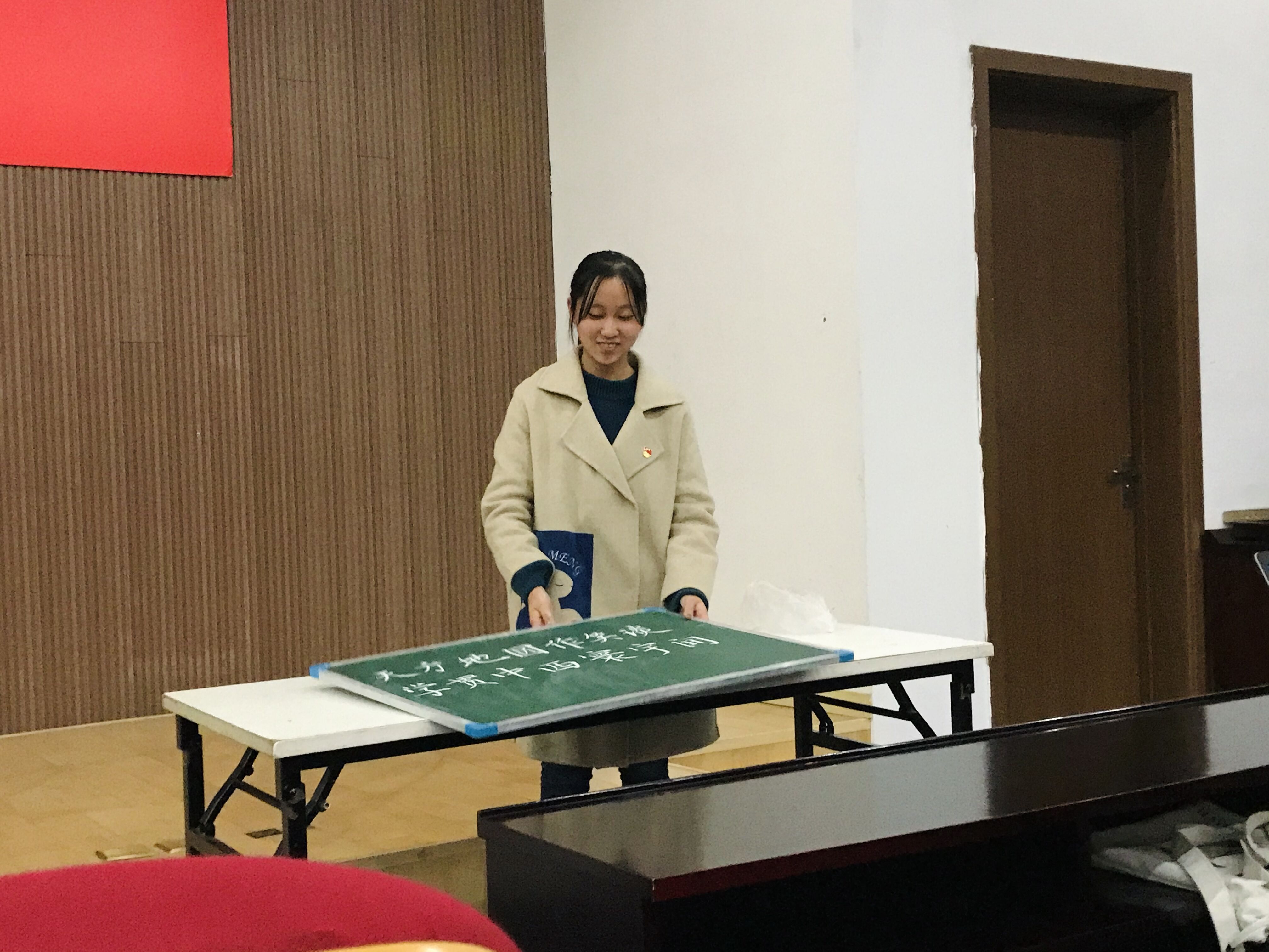 最后,支部青年代表现场以粉笔写班级口号,支部的青年们在台下齐呼“天方地圆作笑谈,学贯中西寰宇间”,气势动人!