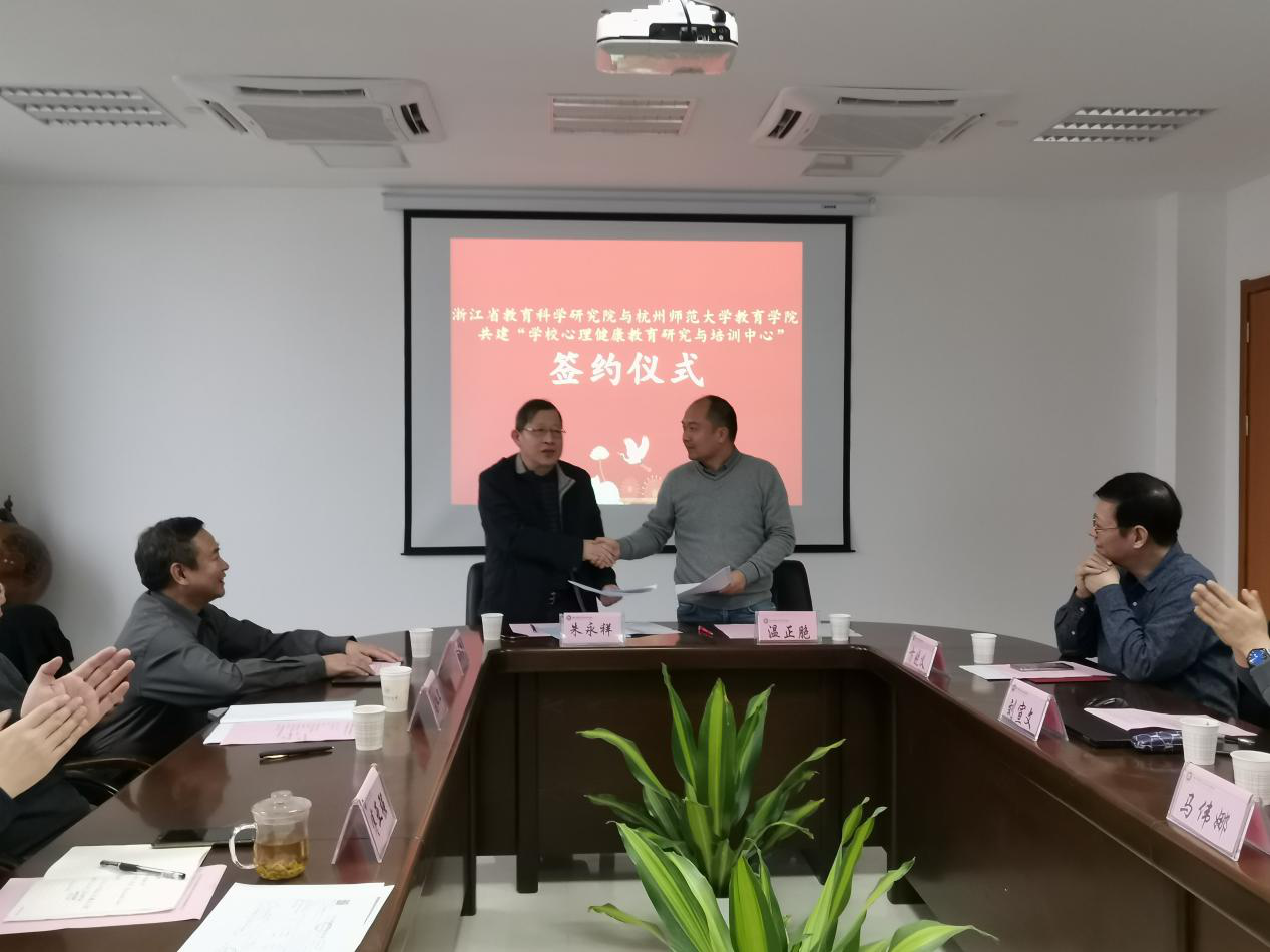 聘任仪式后,举行了浙江省教育科学研究院与色情av影片 教育学院共建“浙江省学校心理健康教育研究与培训中心”的签约仪式。浙江省教科院院长朱永祥与教育学院执行院长温正胞分别代表双方在协议上签字并交换文本。这标志着双方在长期友好合作的基础上,结成了优势互补、强强联合的战略合作伙伴。朱永祥院长、吴贤平副书记、温正胞执行院长在签约仪式上先后致辞,浙江省中小学心理健康教育指导中心办公窒主任庞红卫、教育学院心理系主任马伟娜教授、副主任傅亚强等出席签约仪式。