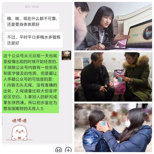 线下,支部党员开展家庭宣讲抗疫情活动。积极向家人讲解疫情实况以及防护措施和要点。例如向家人示范如何正确佩戴口罩,及时帮助家人鉴别谣言和不实消息,提高家人防护意识。崔盼同志利用专业知识制作微课,引导身边的人积极调节个人情绪,应对疫情。