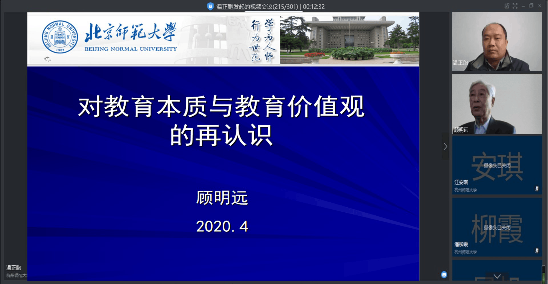 2020年4月22日下午,色情av影片 教育学院第一期“太炎教育云端讲堂”成功在钉钉线上交流平台举行。本次讲堂有幸请到中国教育学会名誉会长、北京师范大学资深教授顾明远先生,做题为“对教育本质和教育价值观的再认识”的学术报告。讲堂由教育学院执行院长温正胞教授主持,我院300余名师生参加。