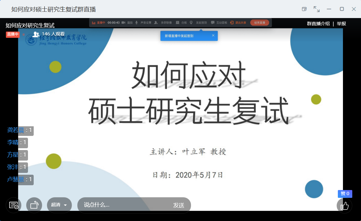 57日上午,我院在钉钉上直播举办了如何应对硕士研究生复试线上讲座。主讲人是我院副院长叶立军教授。来自10个学院的326名学生观看了本次讲座。