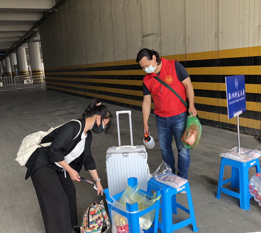 “同学,一路辛苦啦,这边走,我来给行李消毒。”教育学院教工党员志愿者叶剑波老师热情的招呼每一个返校学生,依次完成验码测温、行李消杀、信息登记的程序。