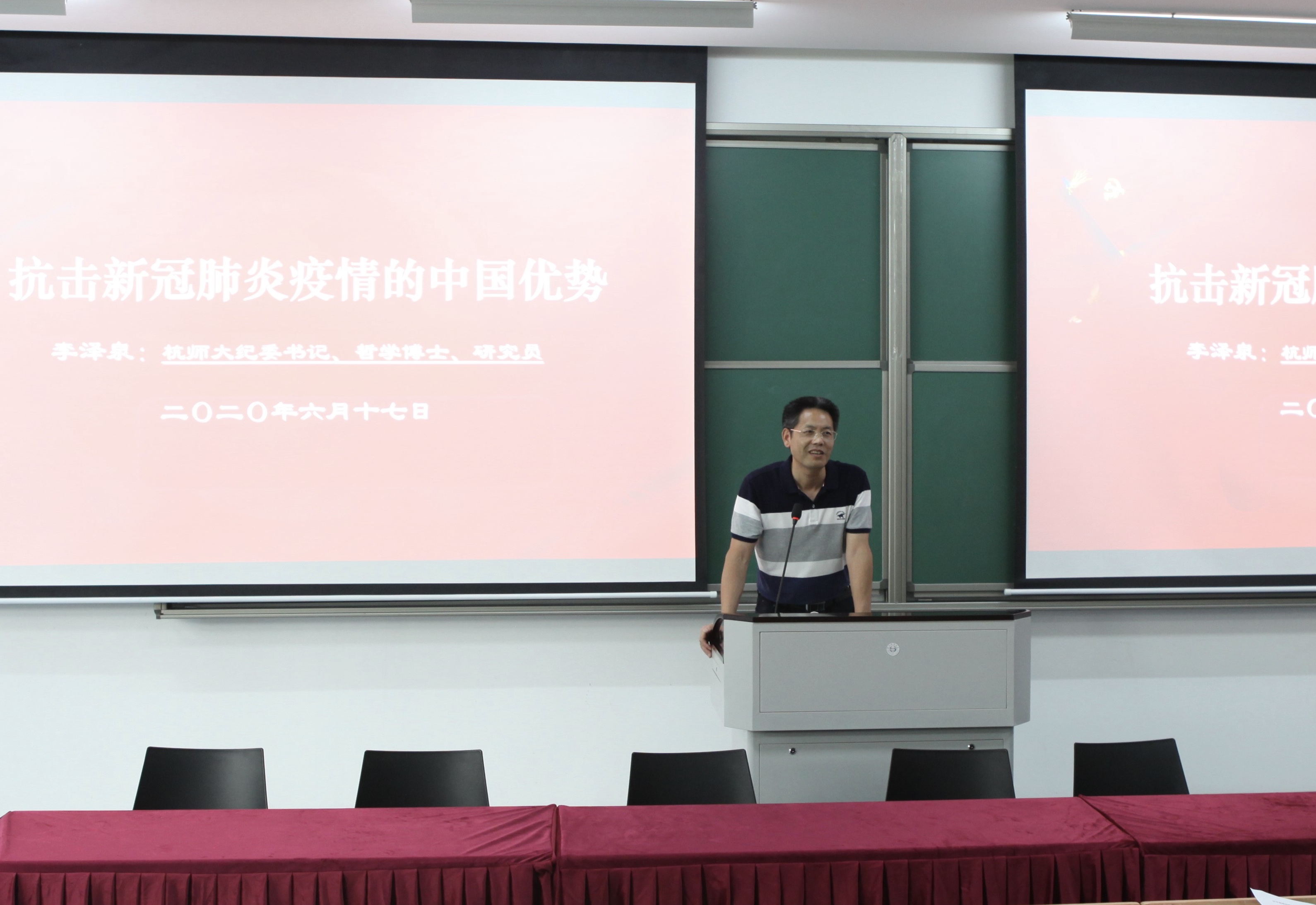 6月17日,校纪委书记李泽泉受邀来到经亨颐教师教育学院,为教职工作“抗击新冠肺炎疫情的中国优势”专题讲座。