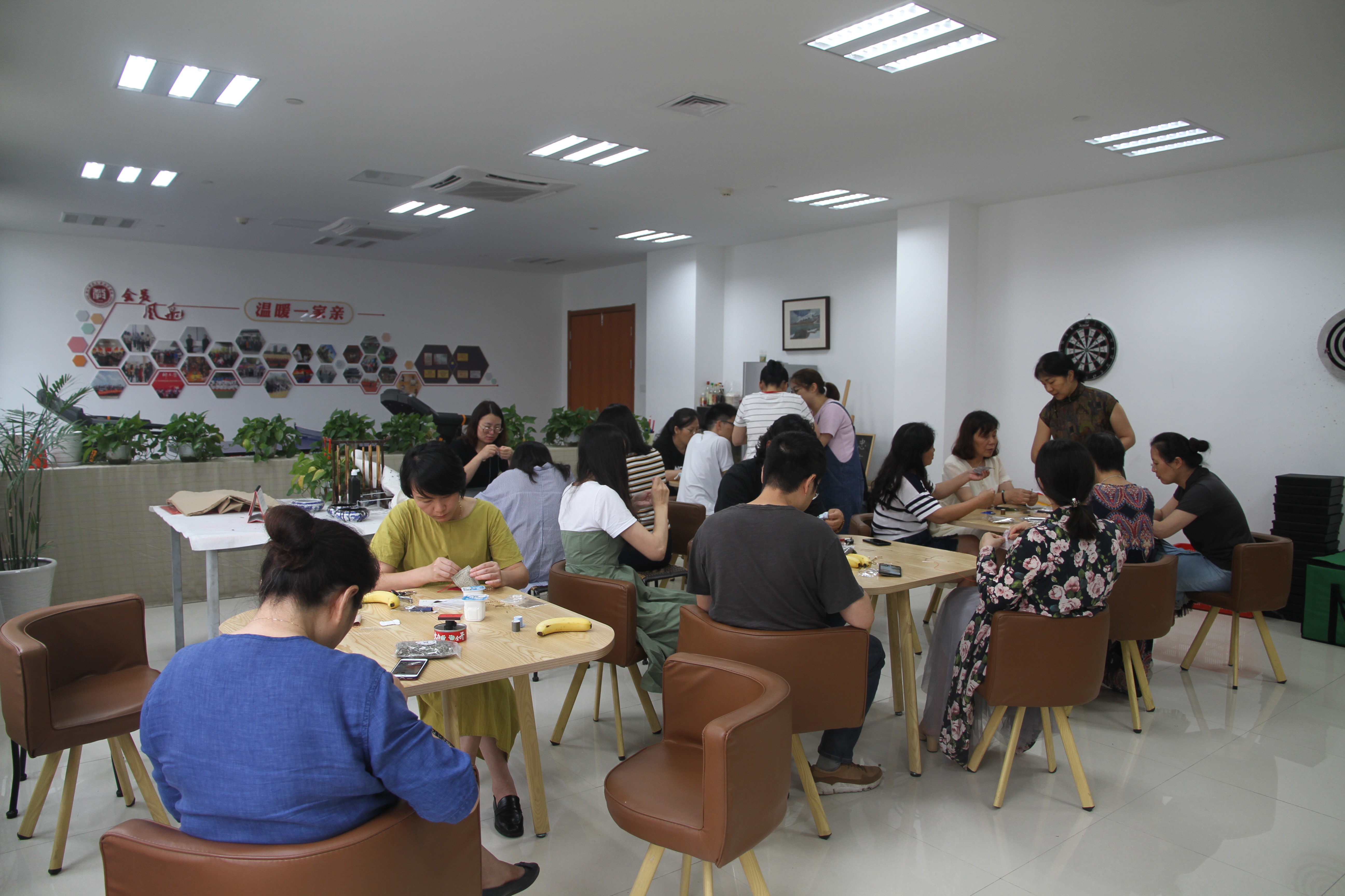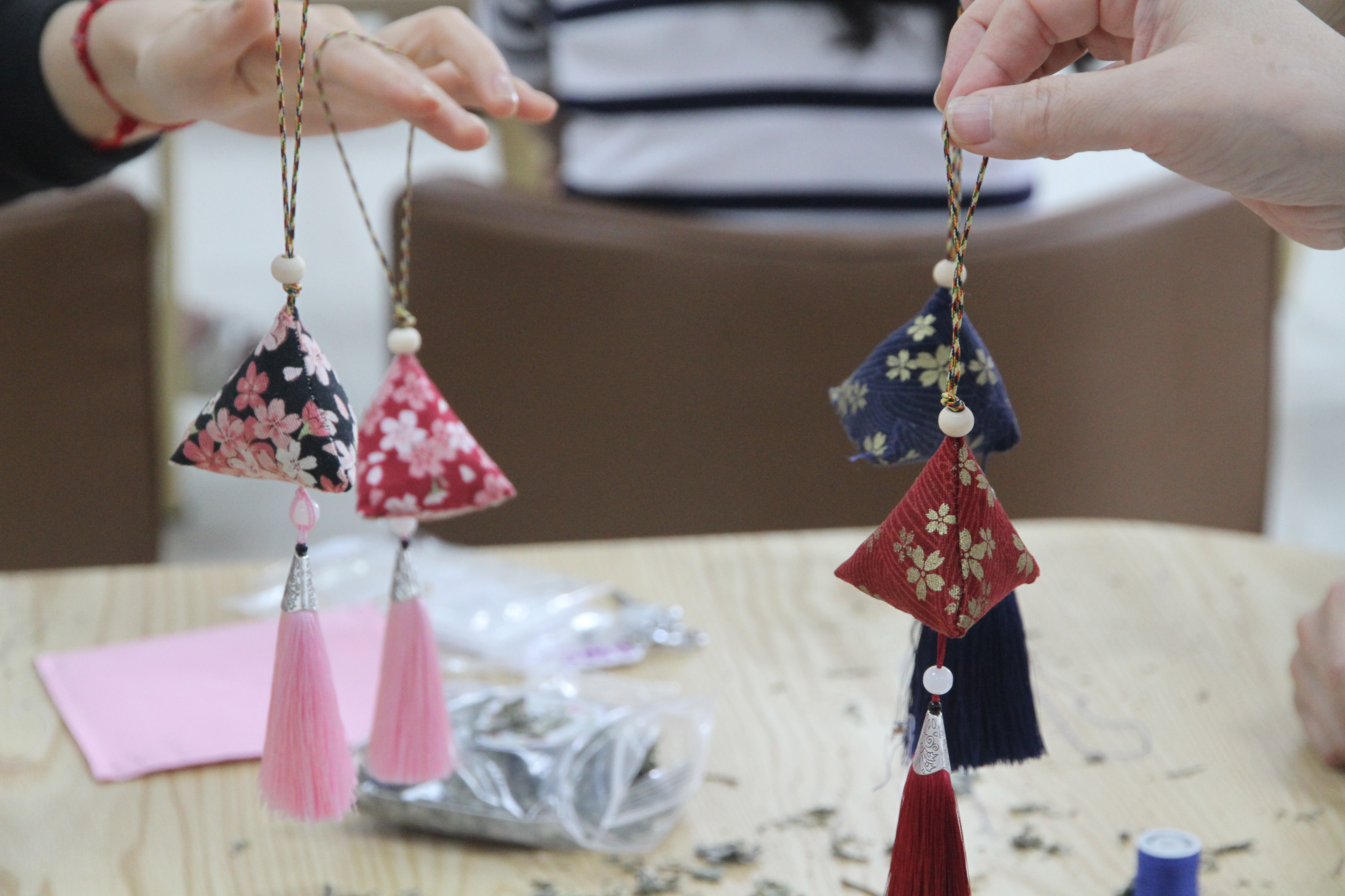 本次活动邀请创意+俱乐部进行指导,面向教育学院所有领导与学院工会委员、小组长,以专业人员现场示范香囊制作流程、参与人员亲手制作香囊的形式展开。