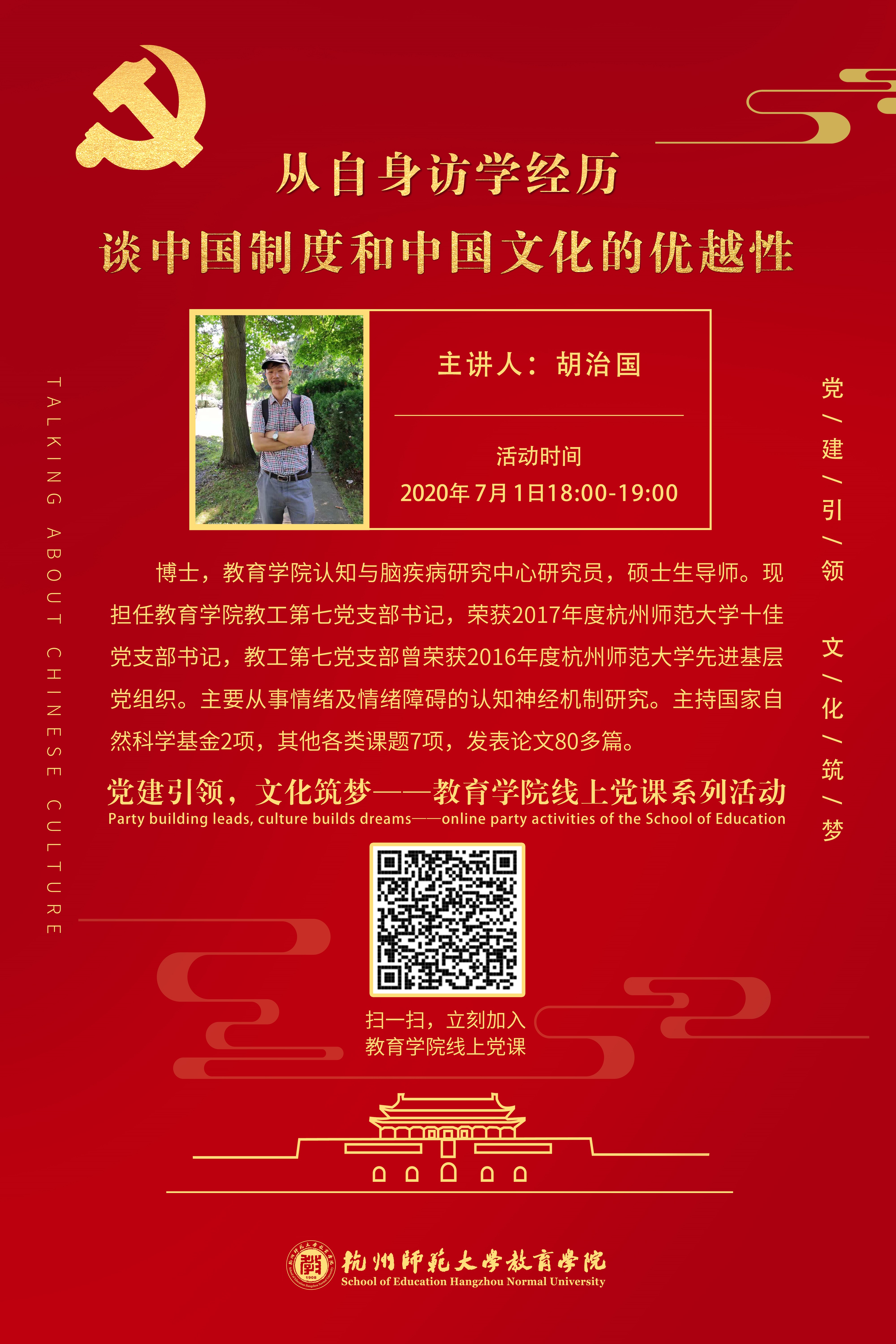 为巩固“不忘初心,牢记使命”主题教育成效,加强教工党支部与学生党支部联动共建,在恰逢建党九十九年的晚上,教育学院党委开展“党建引领,文化筑梦——教育学院线上党课系列活动”,第一讲特邀教育学院教工第七党支部书记胡治国博士作为主讲人,带来了“自身访学经历谈中国制度和中国文化的优越性”的讲座。