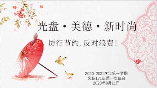 为深入贯彻习近平总书记对制止餐饮浪费行为作出的重要指示精神,弘扬中华民族尊重劳动、勤俭节约的传统美德,进一步推进文明校园建设,9月11日,我院文综171班在线上召开了“光盘·美德·新时尚”的主题班会,班会由班主任黄金丽老师主持。
