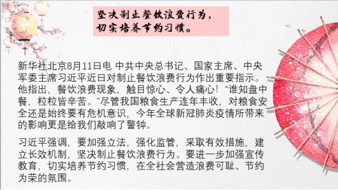 本次线上班会一共设三个环节:1、学习习近平总书记对制止餐饮浪费行为作出的重要指示精神2、观看短视频和案例加深理解3、同学们云分享自己的感悟