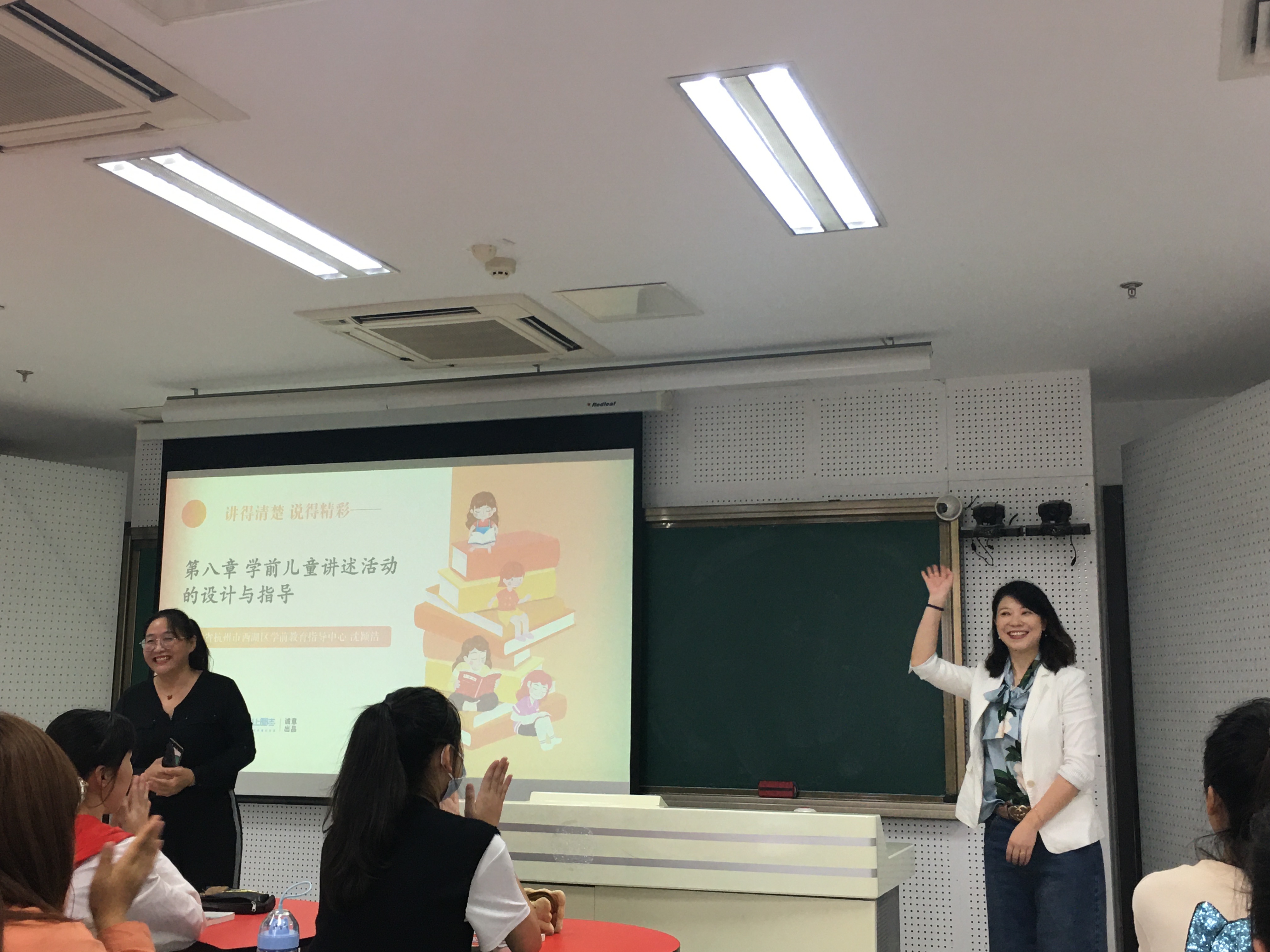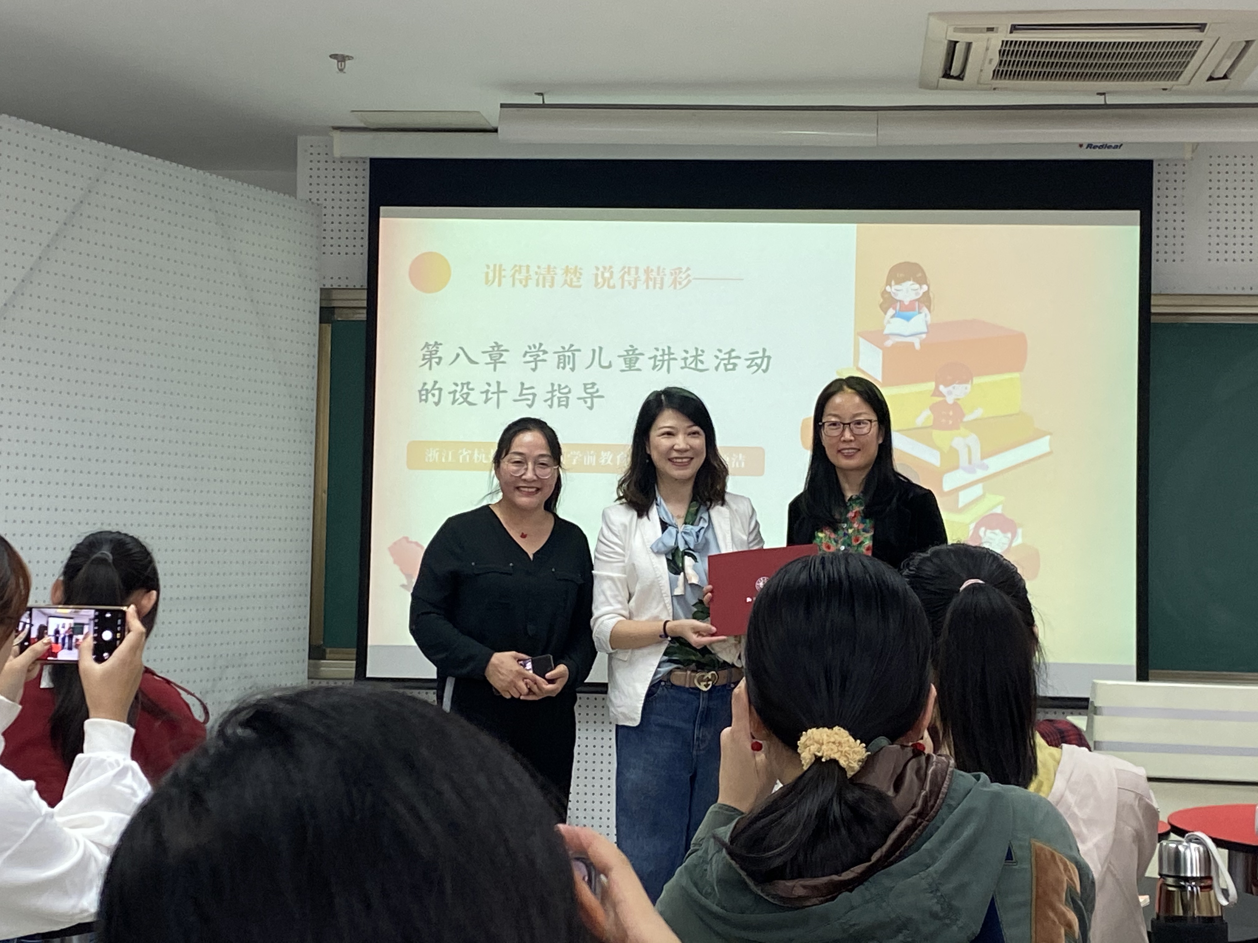 2020年9月22日,由武建芬副教授主持的《学前儿童语言教育》课程本学期第一节双师课程正式开讲。武建芬老师邀请了西湖区学前教育指导中心的沈颖洁老师作为开启双师课程的第一讲。在课程开始前的聘任仪式上,教育学院教学副院长许建美为沈颖洁老师颁发了“双师课程”任课教师聘书。
