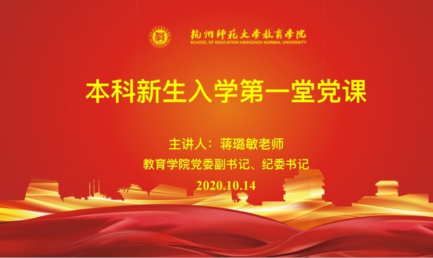 10月14日下午,杭师大教育学院2020级全体新生以线上钉钉直播的形式聆听学院党委副书记、纪委书记蒋璐敏老师上入学第一堂党课。