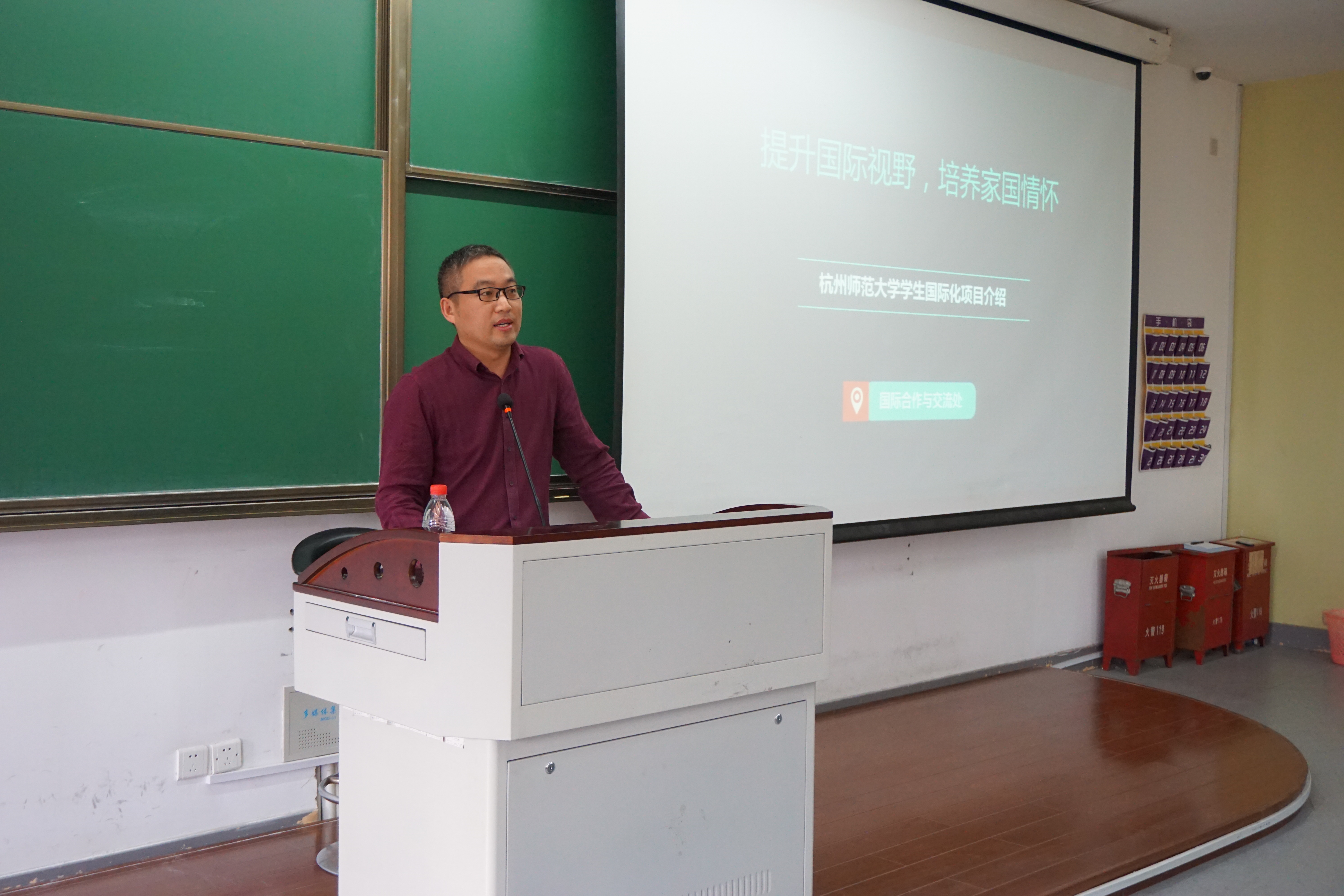 曹老师指出,在世界交流日益紧密的国际化形势下,青年学生更多思考自己的选择和定位,将目光放长远,做出符合发展战略的人生规划,成为卓越人才。随后,曹老师向同学们详细介绍了杭师大学生国际项目的分类,仔细解释了海外各知名高校和我校交流合作的要求、内容以及配套资助鼓励政策。