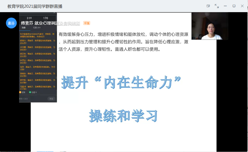 近一段时间,毕业生们面对就业中的各种压力,产生了迷茫、焦虑、急躁的情绪。学院立足同学的切实需求,为了毕业生们的身心全面健康发展,同时帮助同学们做好就业前的心理准备和自我心理照顾,于10月18日下午14时,专门邀请心理学教授、资深大学生心理健康教育专家——傅素芬老师通过钉钉在线直播为同学们做了一场题为《就业心理调适及自我照顾》的讲座。