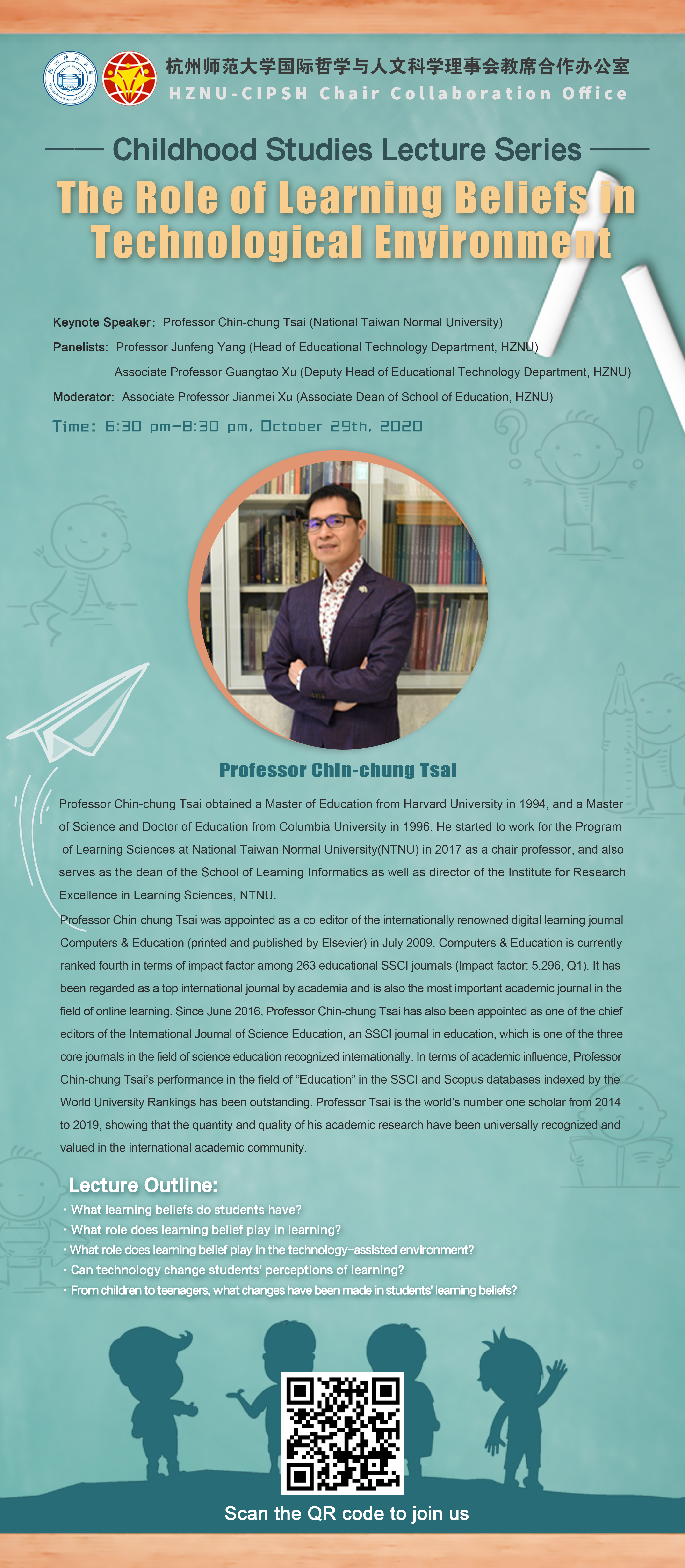 Join us for the lecture series of Childhood Studies. The first lecture, The Role of Learning Beliefs in Technological Environment, will take place online from 6:30 pm to 8:30 pm on October 29th, 2020, organized by HZNU-CIPSH Chair Collaboration Office, sponsored by Hangzhou Normal University.