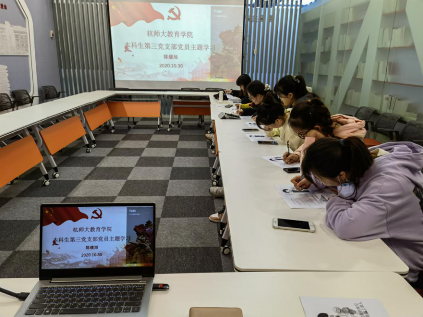 2020年11月1日,教育学院本科生第三党支部全体成员在师生活动中心党员之家开展了主题党日活动。回顾了平凡而又伟大的抗疫故事,学习了习近平总书记教师节重要寄语精神和抗美援朝精神,并传达了十九届五中全会精神,活动由党支部书记陈继旭主持。