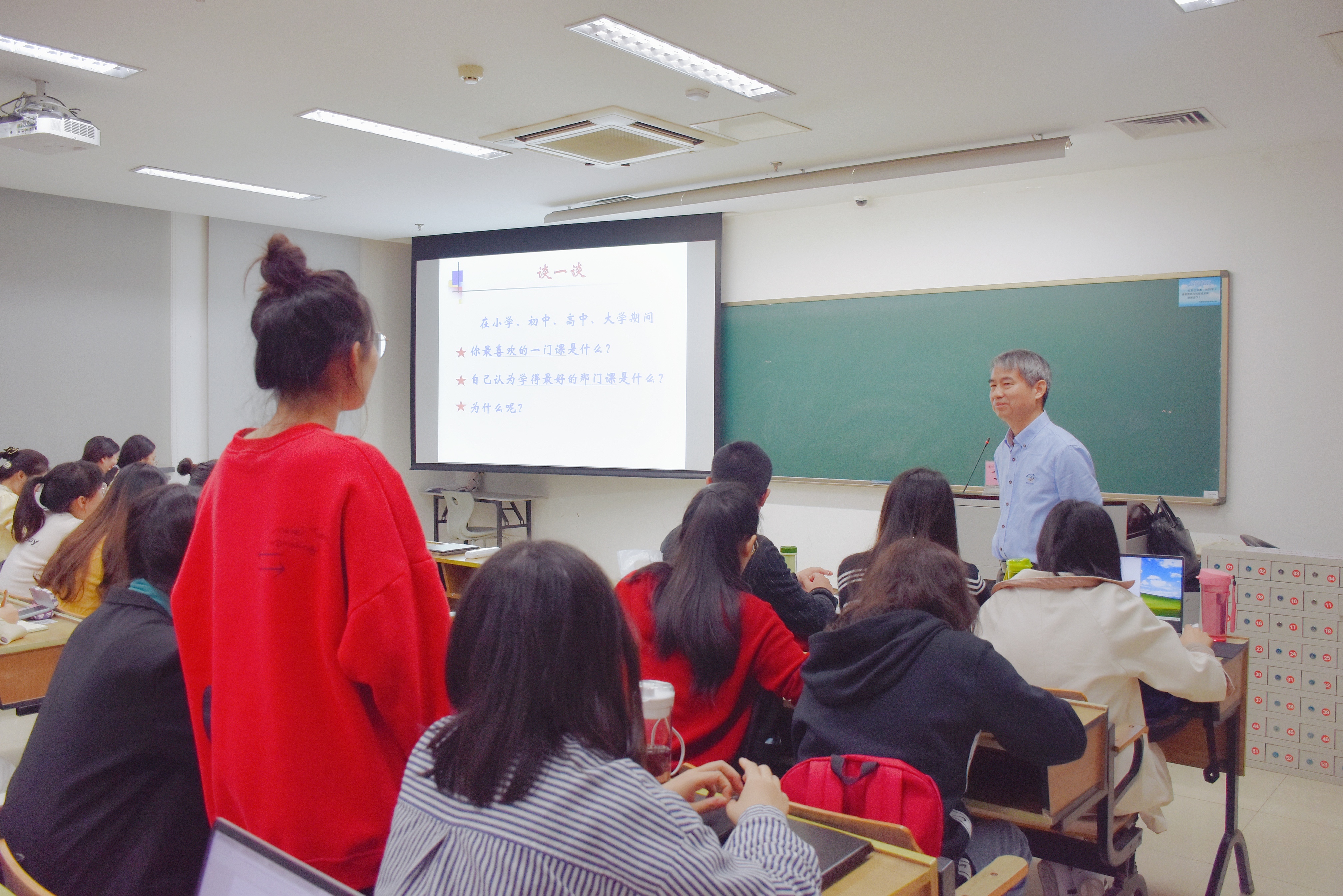讲座伊始,丁老师结合自身工作经历,列举自己三十多年来对学生服务和学校工作不变的热忱,强调教师要时刻牢记爱岗敬业和课大于天的重要性,以及作为人民教师的初心和使命。随后,他提出了“我们需要什么样的教师”,道明教师在教学过程中必须成为“平等中的首席”(first among equals)。针对当前教师角色转变的现象,他从思想素质、知识素质、能力素质、心理素质四个维度分别进行了分享交流,指出新时代教师必须要追求新的起点和新的方向,在得道、得法两大前提下,具备学识渊博和风趣幽默两大特点。在互动环节,他以河姆渡文化为例,请不同专业的同学分享看法,总结“结构化”在教材分析中的重要性。最后,他通过分享TED演讲视频,增进大家对于“教学魔力”理念(educational magic)的理解。现场气氛活跃,笑声不断。