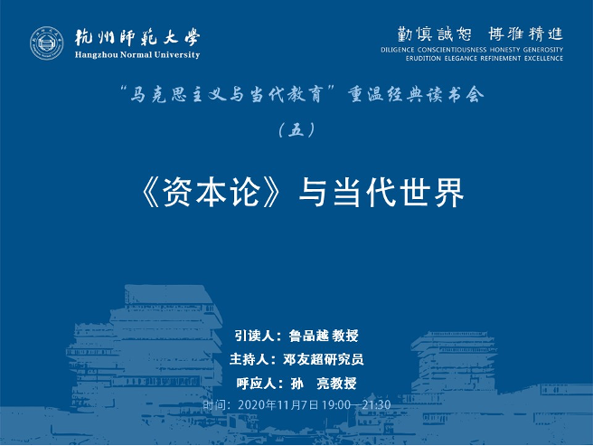 2020年11月7日晚,全国教育基本理论学术委员会主办,华东师范大学基础教育改革与发展研究所和南京师范大学道德教育研究所协办,色情av影片 教育学院和华南师范大学现代教育研究与开发中心共同承办,《教育研究》杂志社、华东师范大学出版社教育心理分社提供学术支持的“马克思主义与当代教育”重温经典系列读书会第五讲“《资本论》与当代世界”成功举办。本次读书会邀请了上海财经大学鲁品越教授担任引读人,华东师范大学哲学系教授孙亮担任呼应人,中国教育科学研究院研究员、《教育研究》总编、全国教育基本理论学术委员会副主任委员邓友超主持本次读书会。