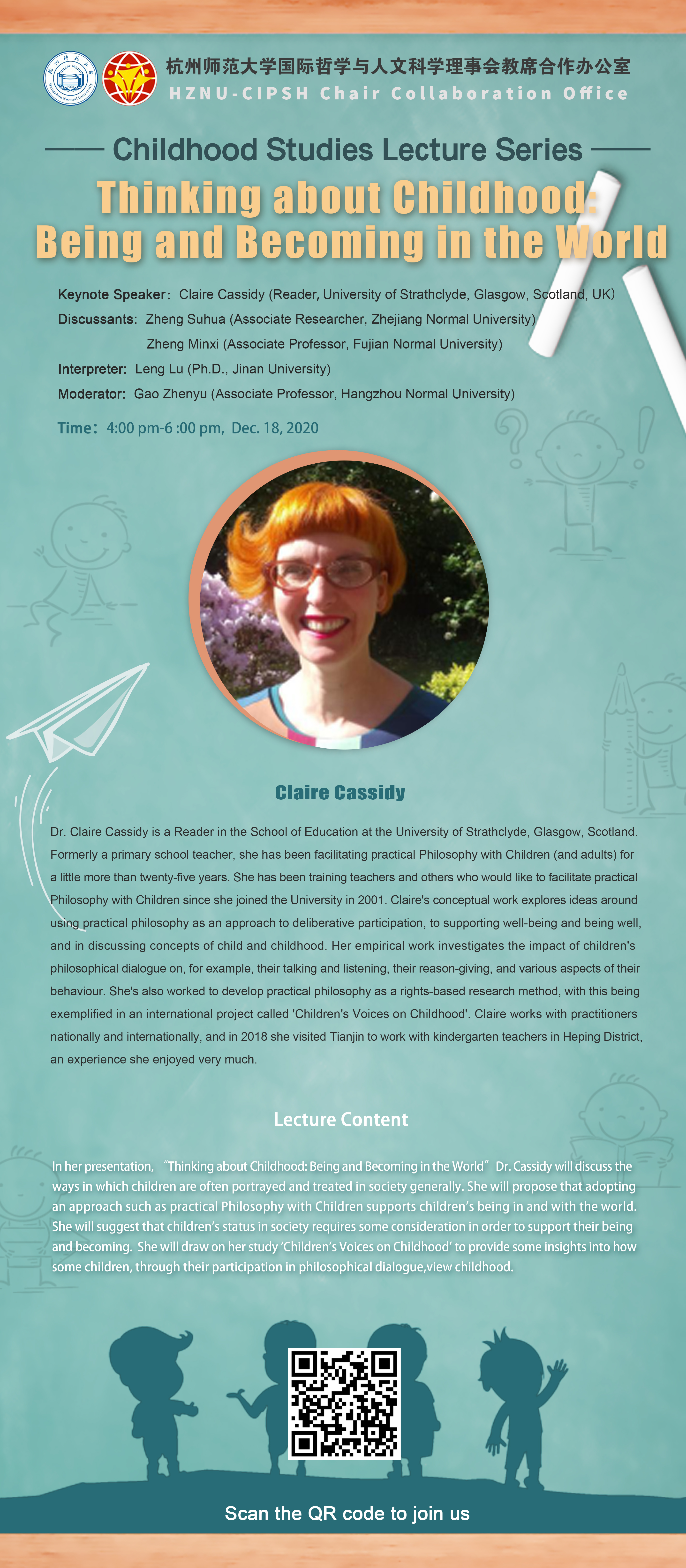Join us for the lecture series of Childhood Studies. The third lecure, Thinking about the Childhood: Being and Becoming in the World, will take place online from 4:00 pm to 6:00 pm on Dec 18, 2020, organized by HZNU-CIPSH Chair Collaboration Office, sponsored by Hangzhou Normal University.
