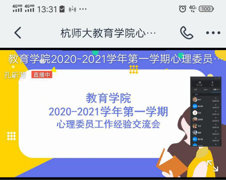 为增进学院心理委员工作经验,加强工作实务能力,同时也为了全面做好学院心理健康教育工作,于2020年12月16日,通过钉钉在线直播的方式,学院组织开展了,学院本学期心理委员工作经验分享会。我们邀请了,教育学院18级徐肖怡同学和外国语学院19级潘瑜同学,为我院心理委员们带来了内容翔实、语言生动有趣的经验分享。学院全体心理委员观看了本次直播。