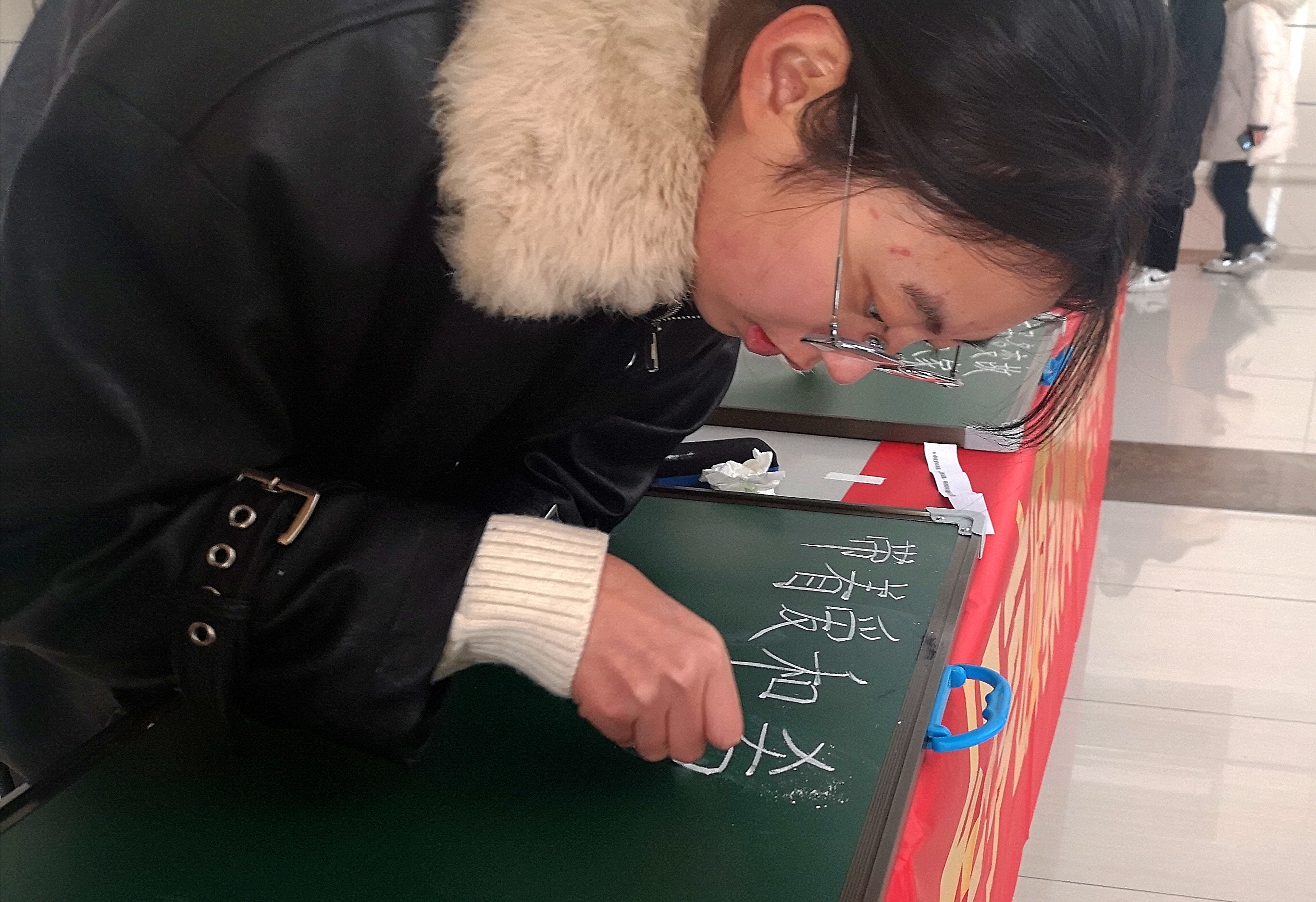 冬日的暖阳照亮比赛现场,参赛的同学们拎着小黑板陆陆续续地到来。抽取题目,领取粉笔和黑板擦,找到一张空桌子,参赛选手便开始认真地书写。选手们弯着腰,紧握粉笔,对每个字的每个笔画精心琢磨修改。而在比赛中,也不鲜同学们互相检查和传授经验的身影,现场充满了互帮互助的和谐比赛氛围。