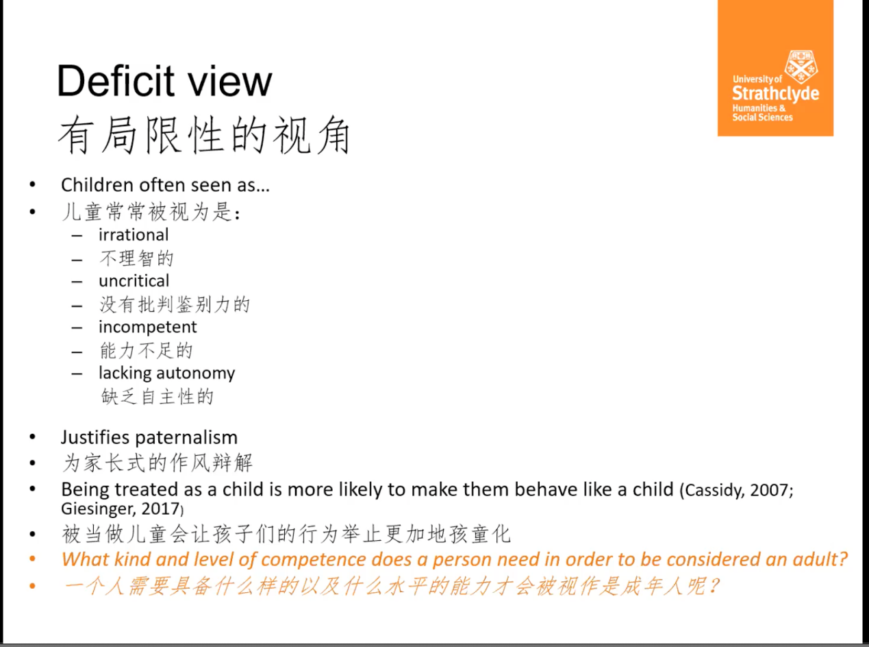 Professor Claire believes that this deficit view is largely due to the binary views of adults and children, which in part stem from a settled cognition that childhood is considered as a way to adulthood. Adulthood is regarded as the expected end and goal, while childhood is only a transitional and preparatory stage. Childhood is a process of becoming, which is transitional and independent by its own right. Children become adults after they experienced childhood. From the adult-child binary view, childhood needs special treatment in a sense, and what cannot be ignored is that adults are often deciding what kind of special treatment to give children and how they should provide it. Children’s agency and participation are therefore limited