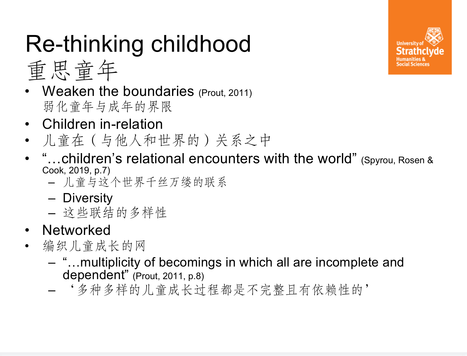 This led Professor Clare to suggest the need for “rethinking childhood.” Under the influence of Spyrou (Spyrou, Rosen & Cook, 2019, p.7), Professor Claire shifts the focus of research from thinking about what childhood is to how childhood is done. She pointed out that considering children in relation means that this allows us to think of children differently not as bounded or limited individuals, but as people who can be or as people who can be examined independently of the world. That means that we can explore different childhood or various childhood experiences. This helps us see the connectedness of children more clearly. The idea of seeing childhood as a connection or networking means that we will not consider the relationship between children and adults as a linear pattern of child-to-adult growth trajectories, but to explore a variety of incomplete and interdependent becomings.