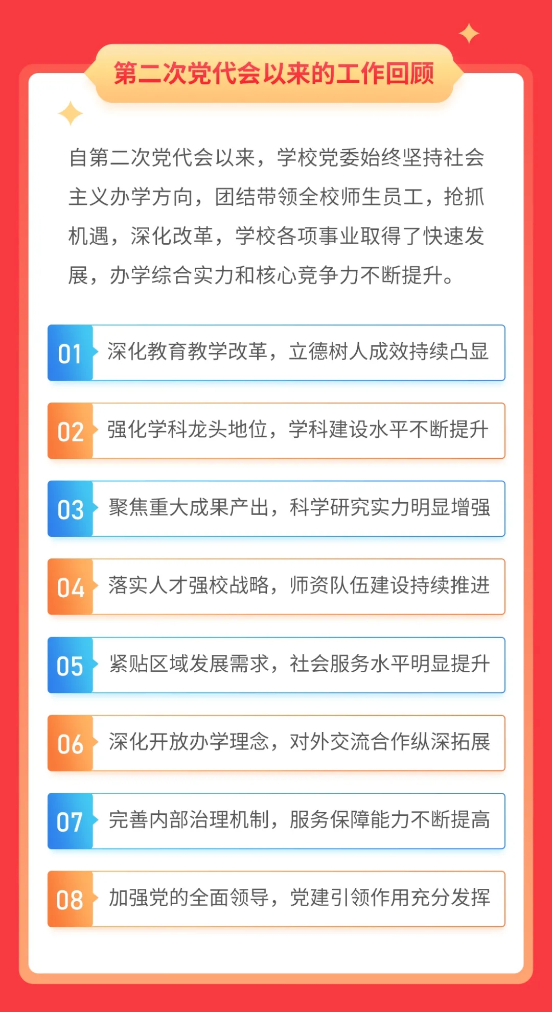 大会充分肯定报告提出的内涵发展、重点发展、特色发展、创新发展、协同发展五大战略,同意报告提出的奋斗目标、“三步走”战略安排以及今后五年重点任务部署。大会强调,建设一流大学必须全面贯彻新时代党的建设总要求,毫不动摇坚持党对学校的全面领导,为学校各项事业发展提供坚强的政治保证。