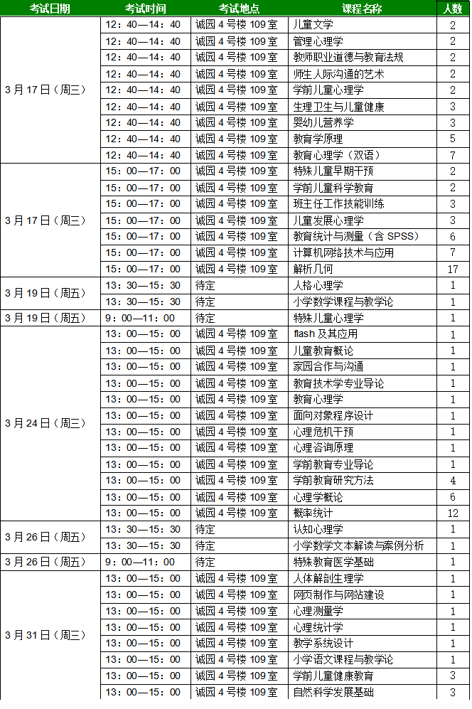 上述两表仅包含教育学院专业课和全校公共课的补考安排,未列在上表中的课程补考事宜具体联系相关学院教务科或者任课教师。具体补考课程自行登录教务处系统查看。通识教育选修课(含公共任选课、公共限选课)正常考核不合格者,无补考资格;重修课程正常考核不合格者,无补考资格;旷考、限考者直接重修,无补考资格。